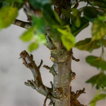 Künstlicher Baum mit natürlichem Stamm und künstlichen Zweigen mit grünem Birkenblatt.