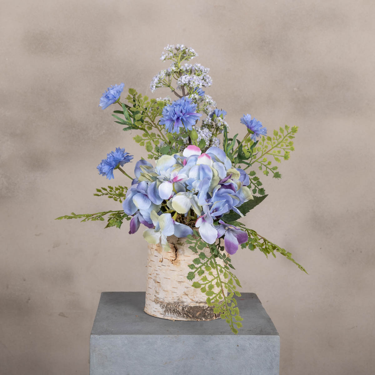 Originelles Kunstblumenarrangement in Blau-Violett-Tönen auf einem stehenden Birkenstamm. Ideal als Tischdekoration.