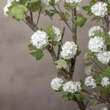 Blütenbaum, gefertigt aus echten, natürlichen Ästen mit weißen Schneeballhortensien-Seidenblumen. Die Höhe des Blütenbaums beträgt ca. 150 cm. Für diese doppelte Ausführung werden zwei verzweigte Äste mit Nieten verbunden. Dieser doppelte Blütenbaum hat eine besonders üppige Ausstrahlung und wird inklusive Keramik-Übertopf geliefert. Der Baum wird mit PU-Schaum im Gefäß stabilisiert und mit einer dekorativen Schicht Baumrinde versehen.