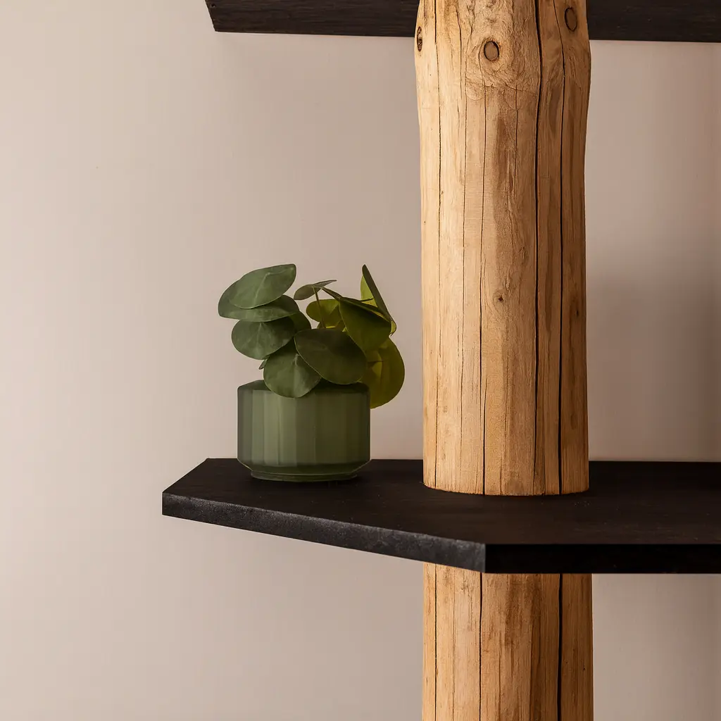Durch die offene Gestaltung bleibt der Schrank geräumig, während du trotzdem mehrere Ebenen für Pflanzen, Wohnaccessoires oder Bücher hast. Jeder Schrank wird handwerklich gefertigt, sodass die Maserung, Astlöcher und leichten Krümmungen des Holzes sichtbar bleiben und kein Exemplar genau wie das andere ist.