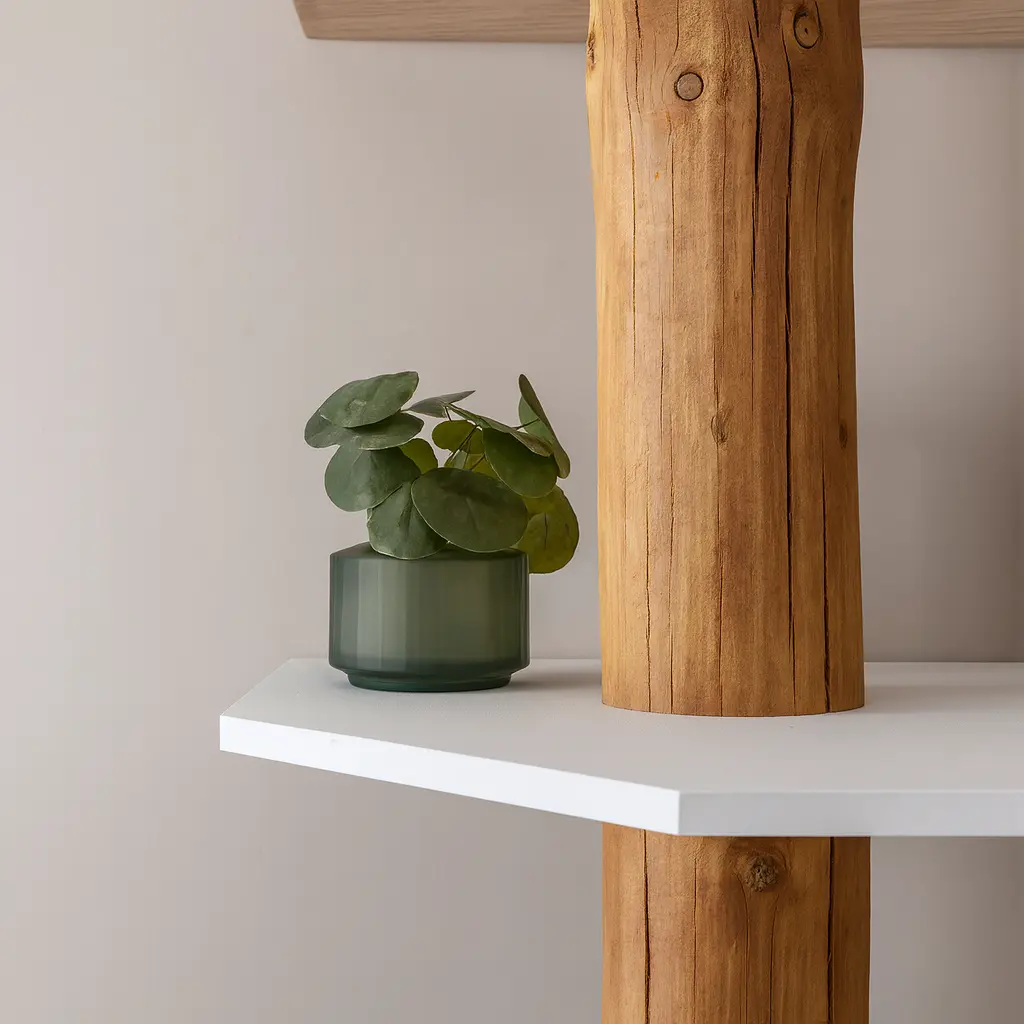 Dieser Eckregal aus Baumstamm macht aus einer ungenutzten Ecke einen echten Hingucker. Der massive Baumstamm ist das natürliche Rückgrat und mit einem warmen Old Naturel-Öl behandelt. Die organische Form des Holzes passt super zu den schlichten weißen Regalböden, die um den Stamm herum zu schweben scheinen.