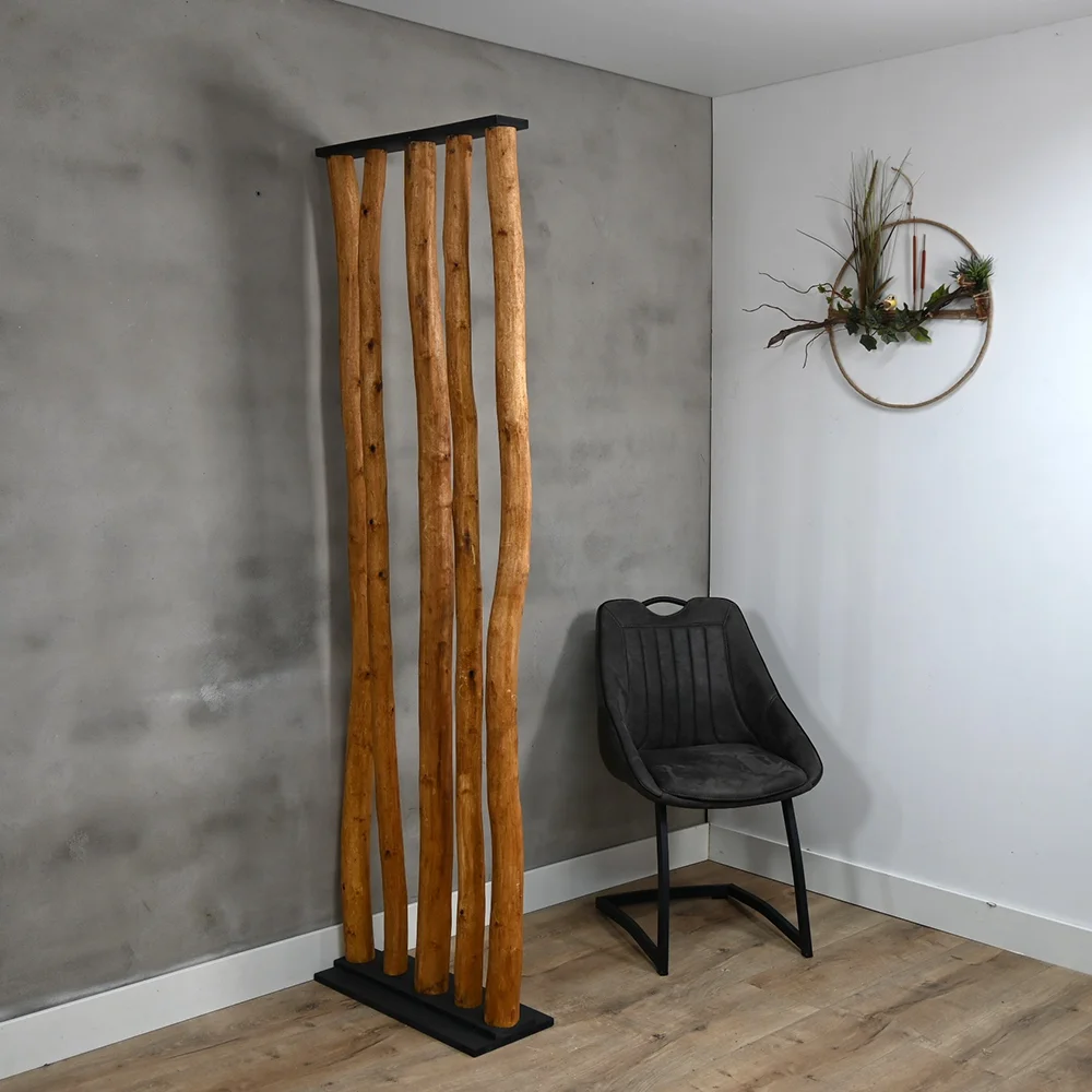Der robuste schwarze Sockel sorgt für Stabilität und einen starken Kontrast zu den naturfarbenen Stämmen. Das Ergebnis ist ein Raumteiler, der nicht nur als Trennwand dient, sondern auch ein echter Blickfang in deinem Zuhause, Büro oder Restaurant ist.