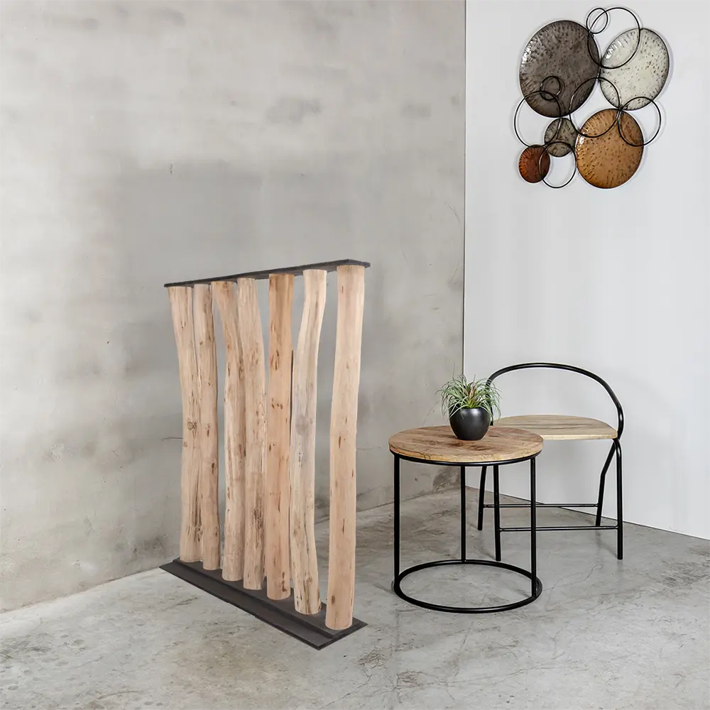 Die Stämme sind fest in einem schwarzen Holzsockel verankert, was dem Ganzen einen klaren, robusten Look verleiht. Mit seinem zeitlosen und minimalistischen Design eignet sich dieser Raumteiler ideal als stilvolle Trennwand zwischen Wohnräumen oder als dekoratives Element, das Atmosphäre in Büros, Gastronomiebetrieben oder Ausstellungsräumen schafft.
