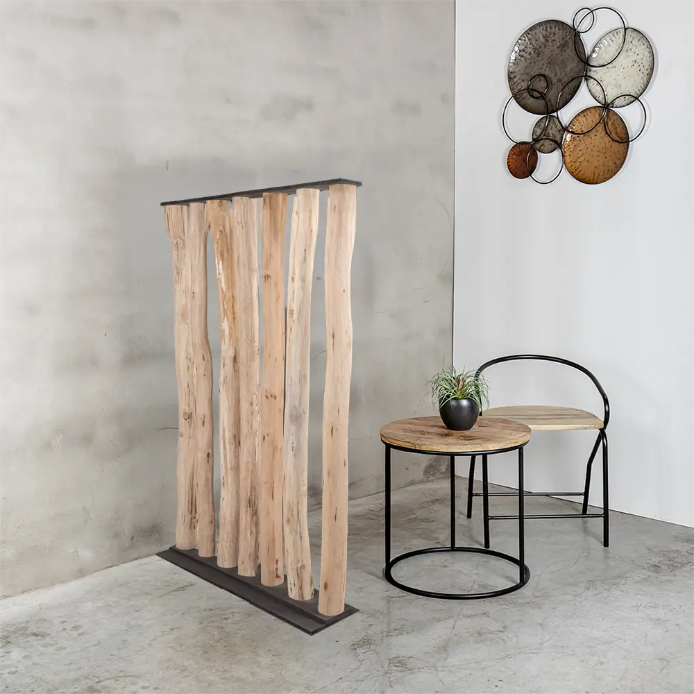 Die Stämme sind fest in einem schwarzen Holzsockel verankert, was dem Ganzen einen klaren, robusten Look verleiht. Mit seinem zeitlosen und minimalistischen Design eignet sich dieser Raumteiler ideal als stilvolle Trennwand zwischen Wohnräumen oder als dekoratives Element, das Atmosphäre in Büros, Gastronomiebetrieben oder Ausstellungsräumen schafft.