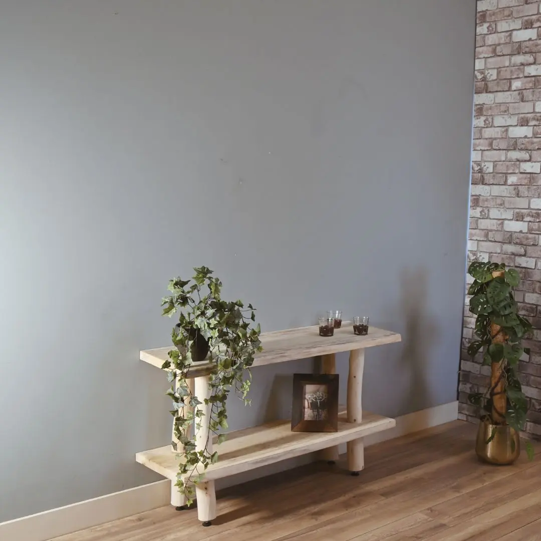 Mach dein Wohnzimmer mit dem TV-Möbel Esper aus Baumstamm zu einem natürlichen Blickfang. Das Möbelstück kombiniert natürliche Baumstammbeine mit massiven, geschliffenen Laubholzregalen. Die organischen Formen der Stämme und die ruhige Maserung des Holzes sorgen für einen einzigartigen Kontrast: roh, aber raffiniert.