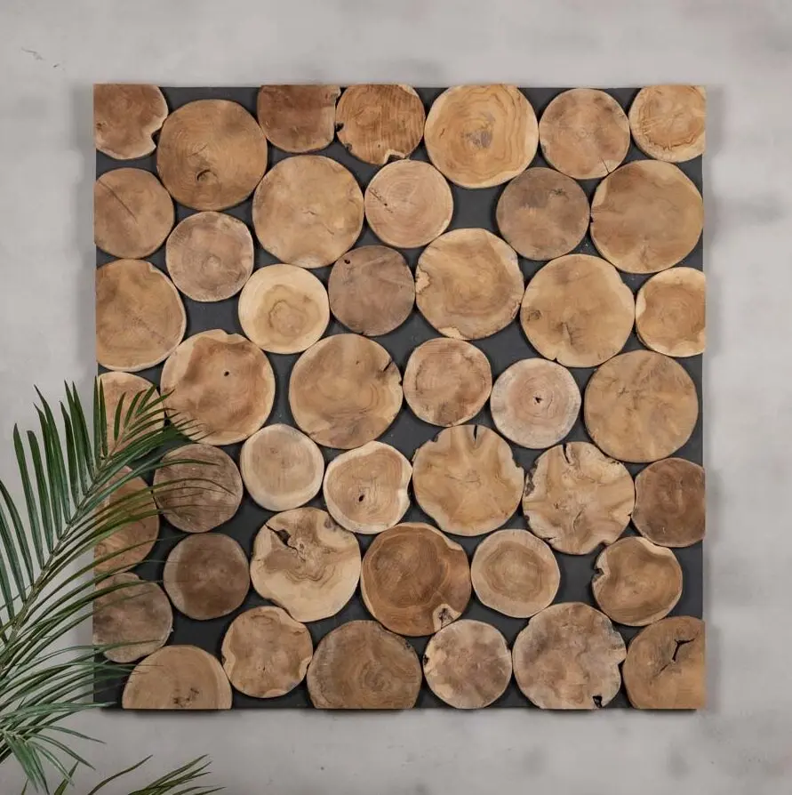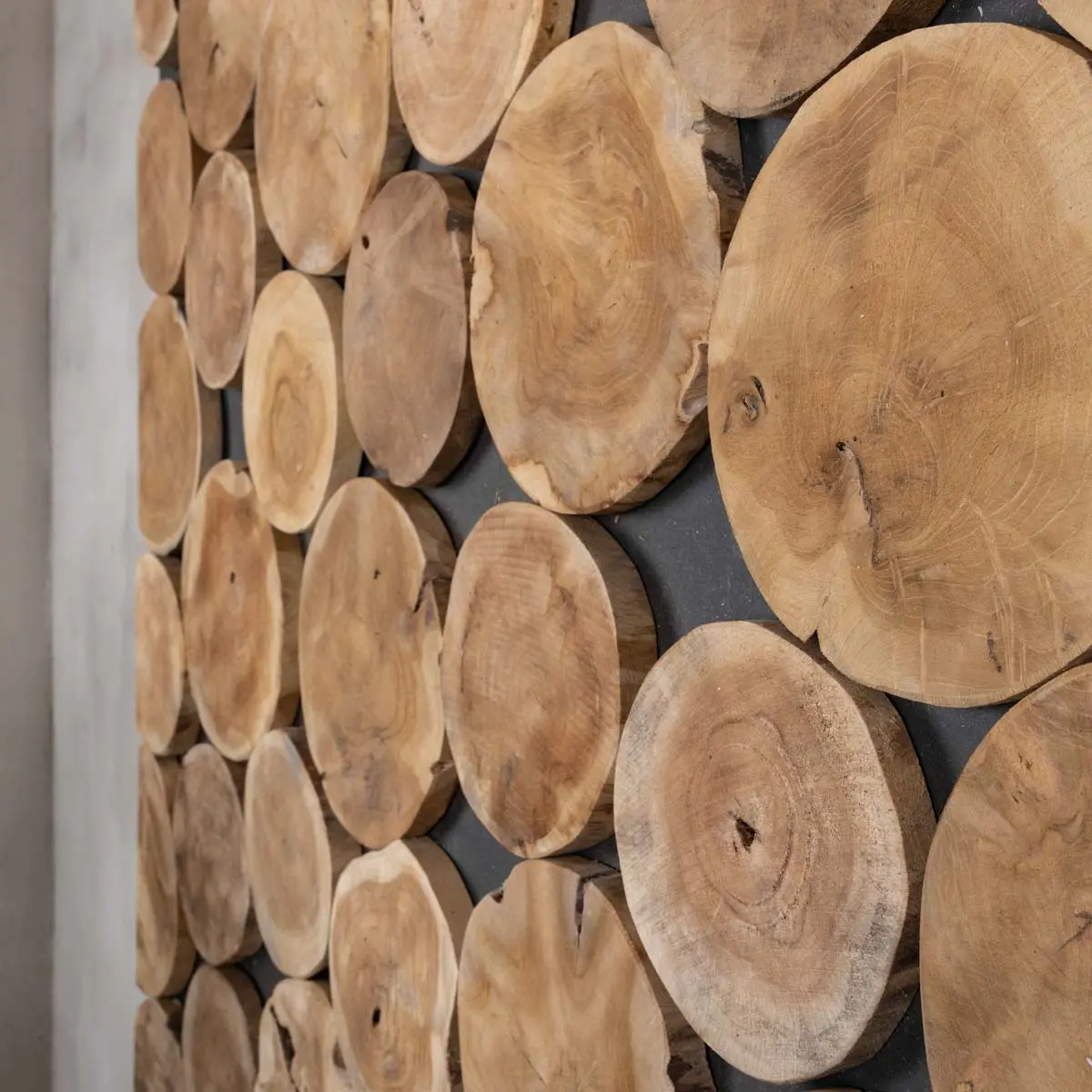 Die Baumstamm-Wanddekoration Bjorn ist ein mutiges und stilvolles Statement für jede Wand. Dieses einzigartige Paneel besteht aus massiven Teakholzscheiben, die jeweils einen Durchmesser von etwa 20 bis 25 cm haben. Die warmen Farbtöne und die natürliche Maserung des Teakholzes sorgen für einen robusten, stimmungsvollen Look.