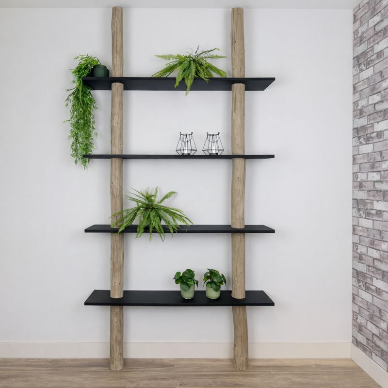 Baumstamm-Wandschrank Javi mit 2 natürlichen Baumstämmen, die mit grauem Öl behandelt sind, und 4 geraden, schwarzen Regalböden.