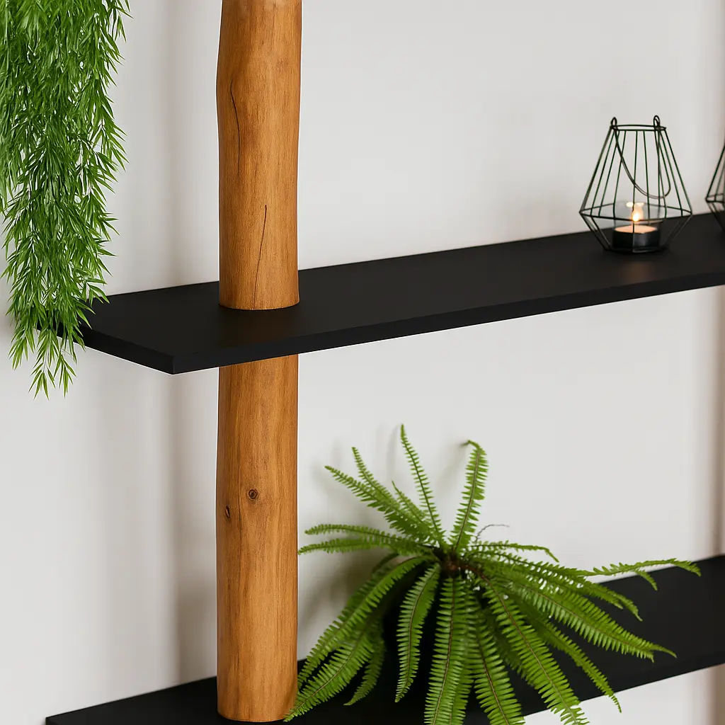 Dieses Wandregal bringt die Authentizität von zwei natürlichen Baumstämmen mit dem coolen Look von schwarzen MDF-Regalböden zusammen. Die Regalböden sind gerade angebracht, was für einen ruhigen und symmetrischen Look sorgt. Ein echter Baumstamm bildet das vertikale Rückgrat und sieht mit einem Old Naturel-Öl warm und gemütlich aus; seine organische Form passt super zu den coolen, schwarzen Regalböden.