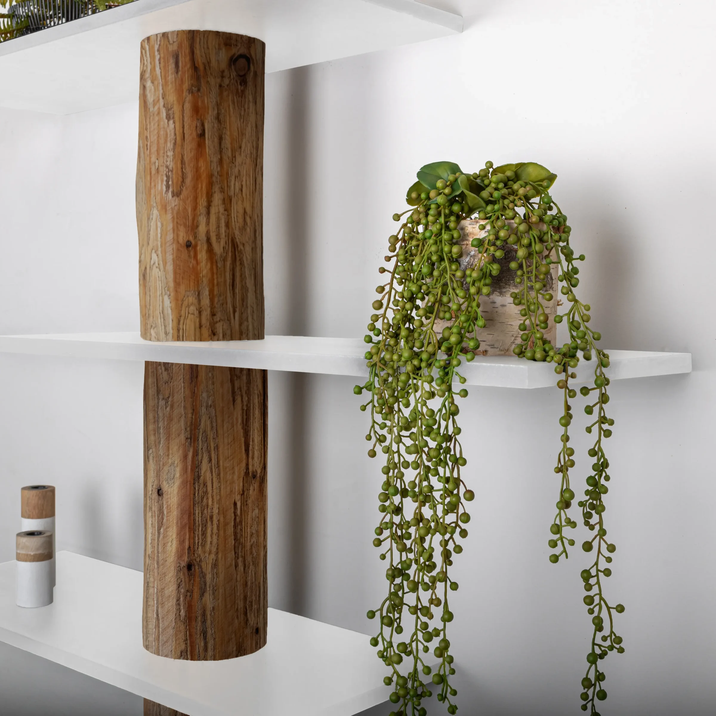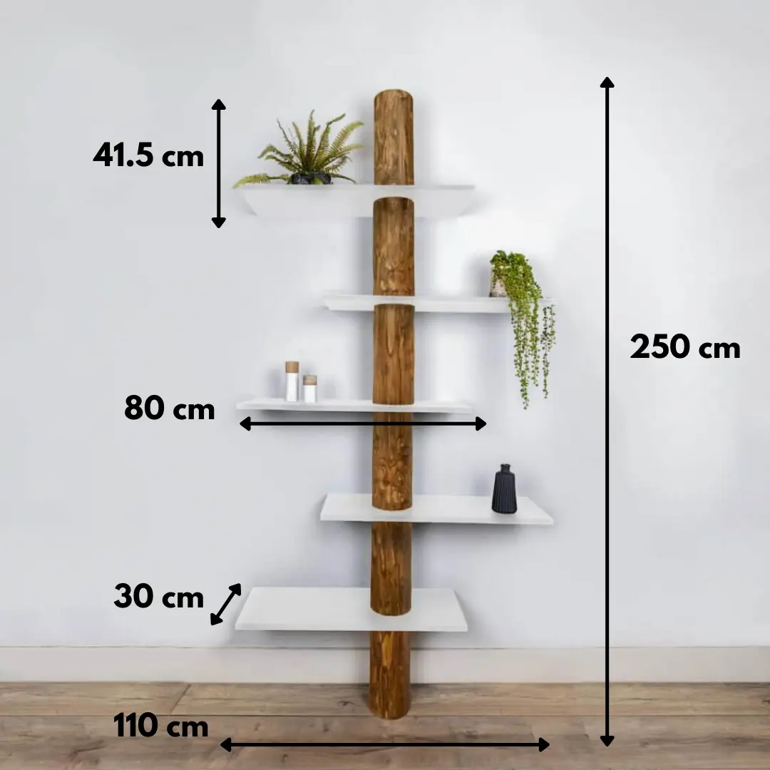 Baumstamm-Wandschrank Alrik mit einem natürlichen Baumstamm, der mit Eichenöl behandelt wurde, und 5 weißen, versetzten Regalböden.