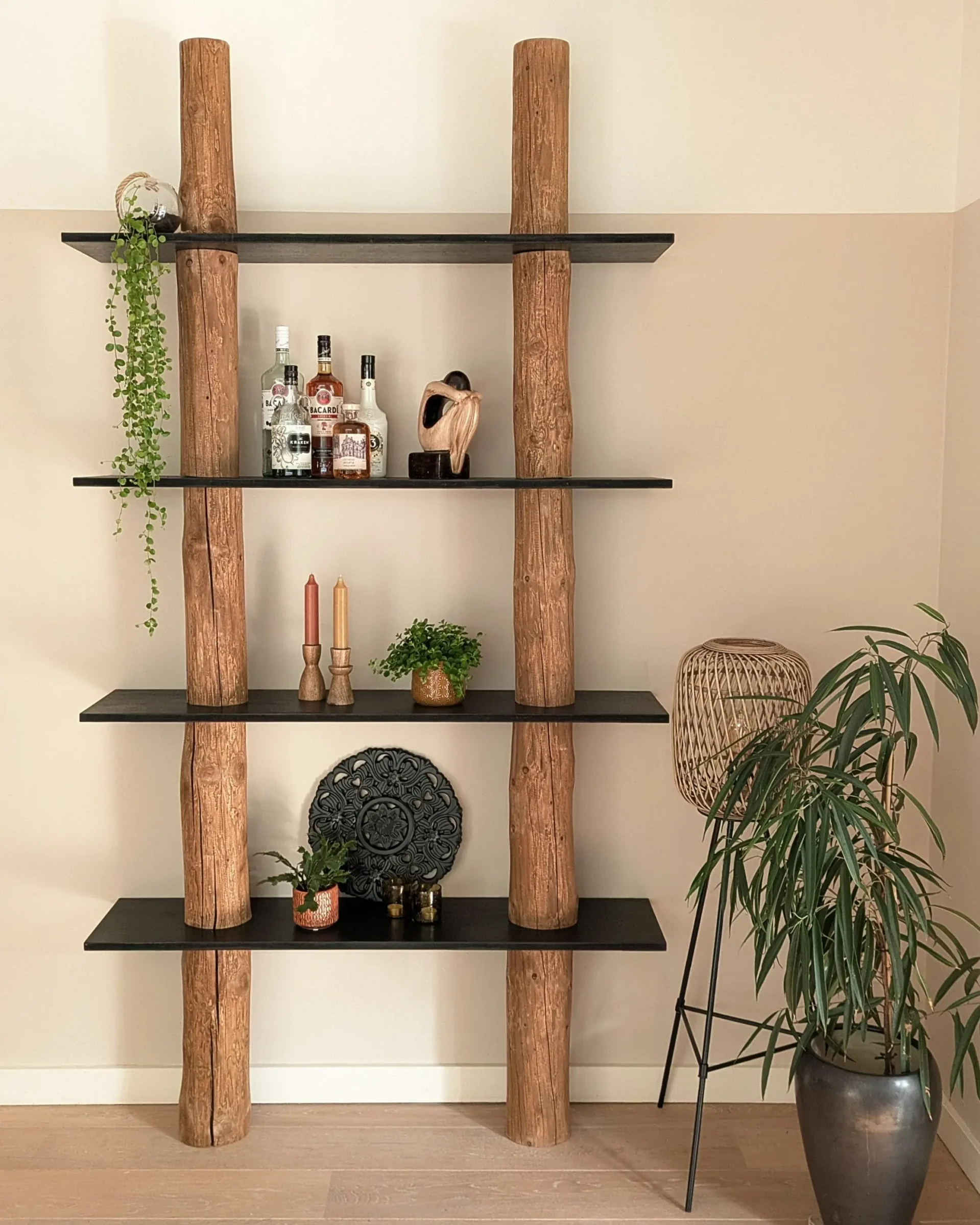 Baumstamm-Wandschrank Odin mit 2 natürlichen Baumstämmen, die mit Eichenöl behandelt wurden, und 4 geraden, schwarzen Regalböden.