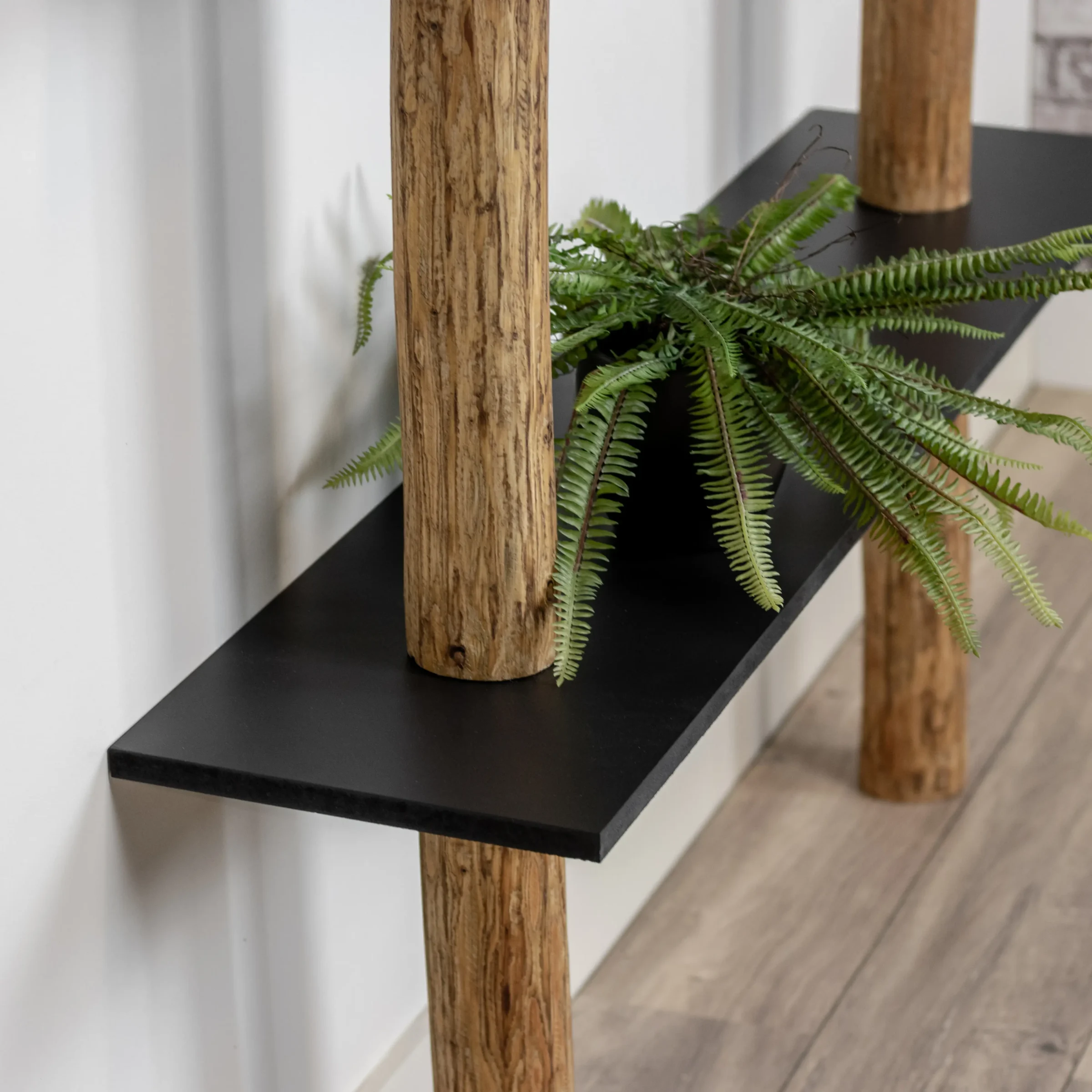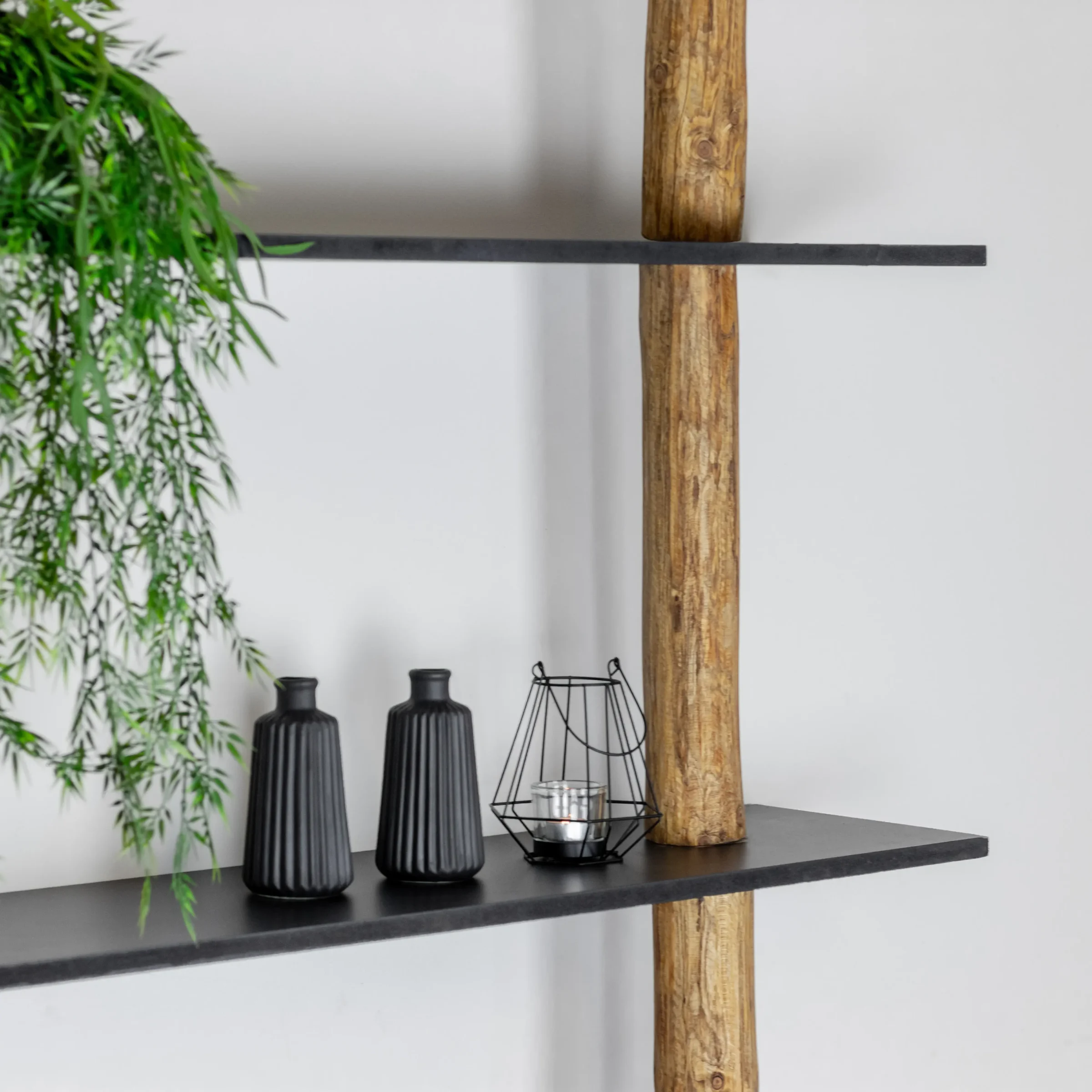 Dieses Wandregal verbindet die Authentizität von zwei natürlichen Baumstämmen mit dem klaren Look von schwarzen MDF-Regalböden. Die Regalböden sind gerade angebracht, was für einen ruhigen und symmetrischen Look sorgt. Ein echter Baumstamm bildet das vertikale Rückgrat und wird mit Eichenöl behandelt, was ihm einen warmen und stimmungsvollen Look verleiht; seine organische Form steht in schönem Kontrast zu den klar gestalteten schwarzen Regalböden.