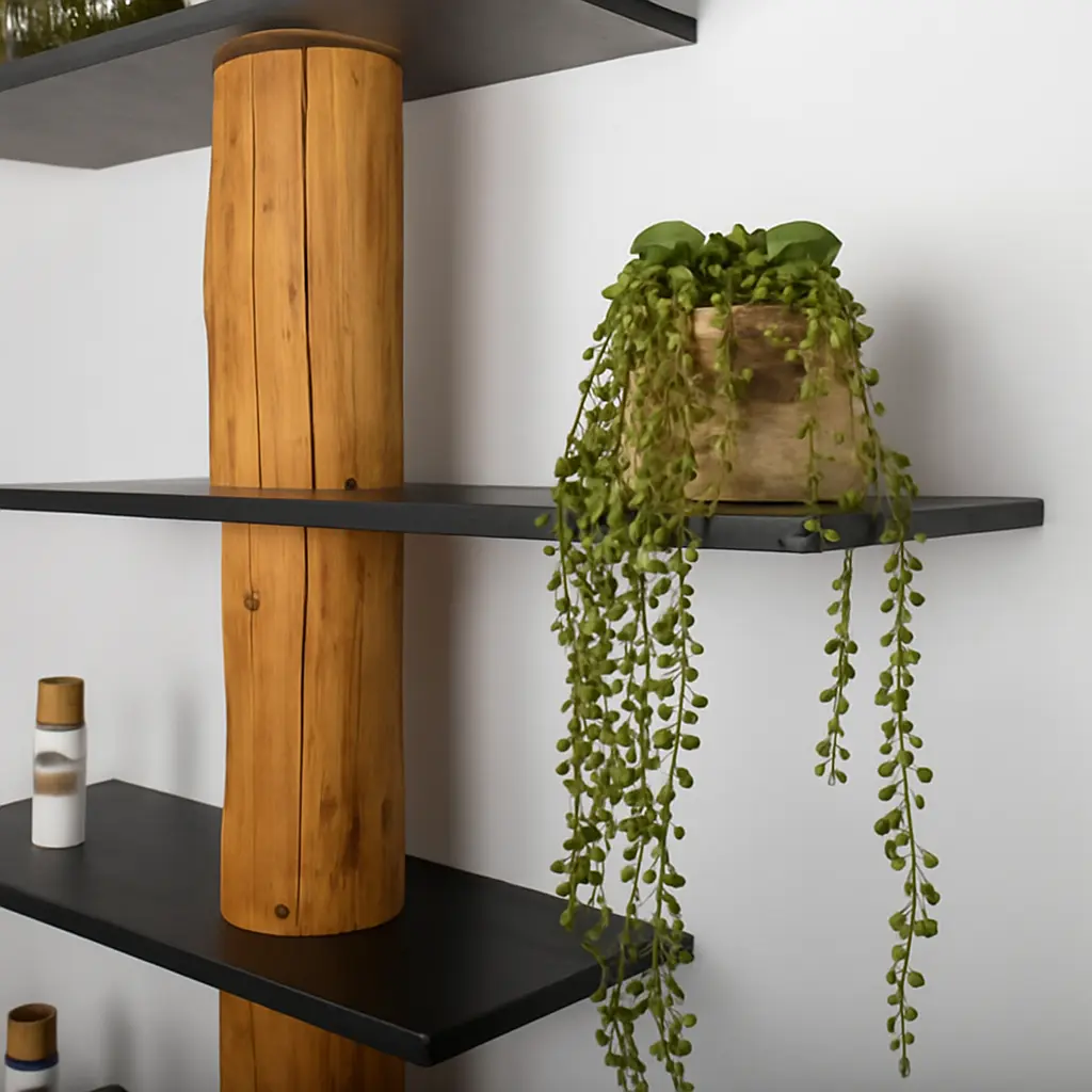 Baumstamm-Wandschrank Kiran mit einem natürlichen Baumstamm, der mit einem Old Naturel-Öl behandelt wurde, und 5 schwarzen, versetzt angeordneten Regalböden.