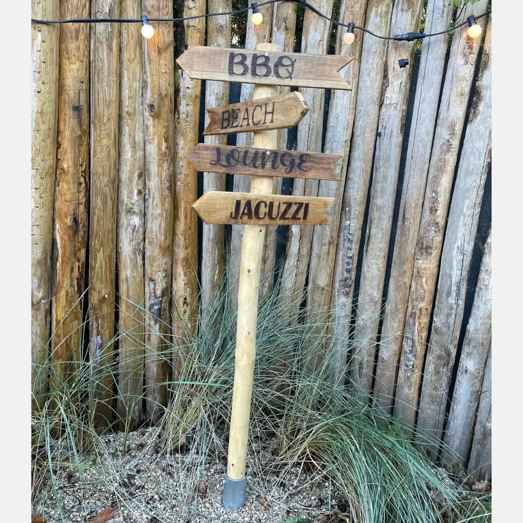 Der Wegweiserpfahl ist aus Naturholz gefertigt, was ihm ein warmes, ländliches Aussehen verleiht. Durch die Verwendung natürlicher Materialien und die handwerkliche Verarbeitung können leichte Abweichungen in der Holzstruktur und Farbe auftreten, was zum authentischen Charakter des Produkts beiträgt.