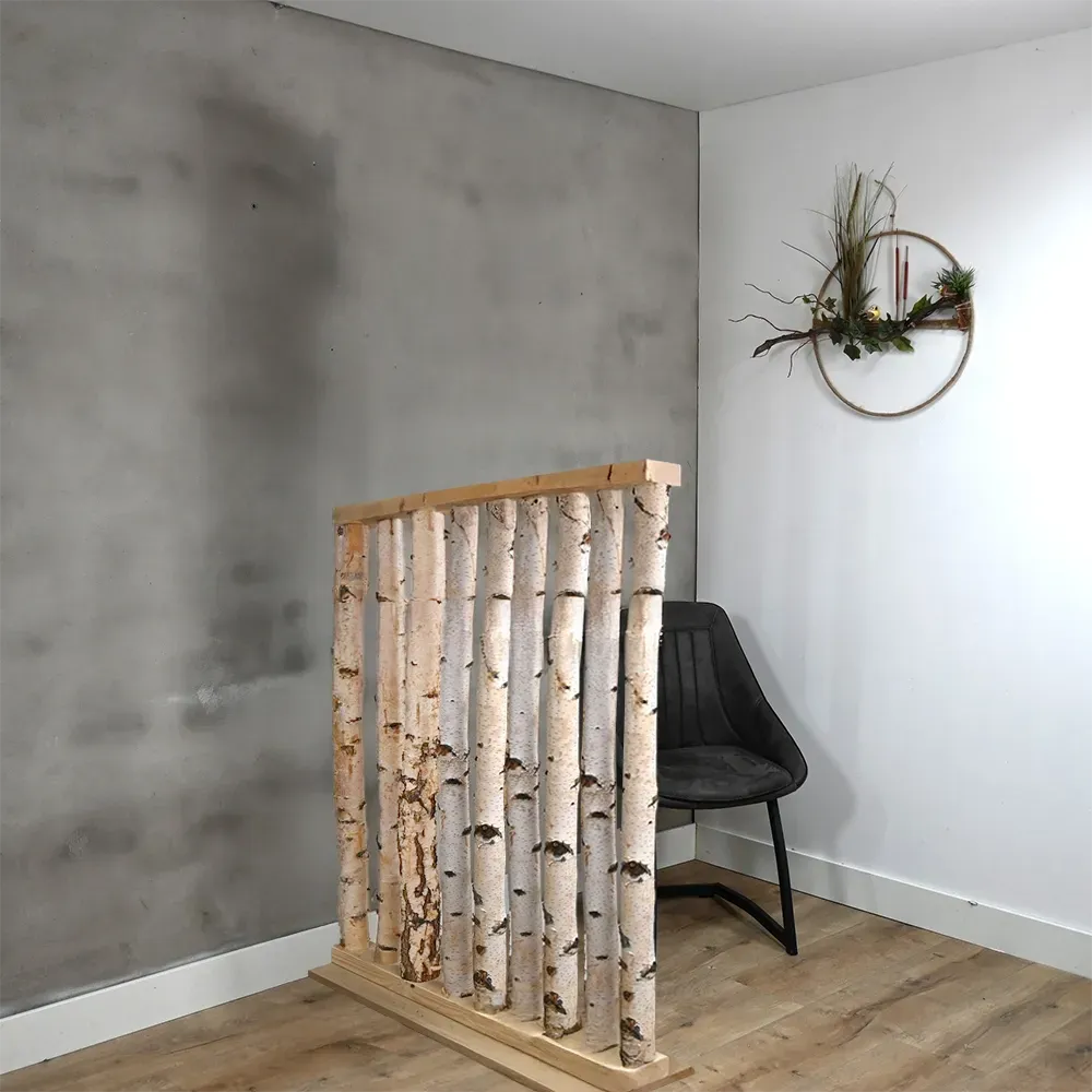 Der Alvar Raumteiler bringt den Charme der Natur direkt in dein Zuhause. Er ist aus echten Birkenstämmen mit Rinde gemacht, jeder mit einer einzigartigen Struktur und Maserung. Die Stämme stehen auf einem natürlichen Holzsockel, was dem Ganzen einen warmen und harmonischen Look verleiht.