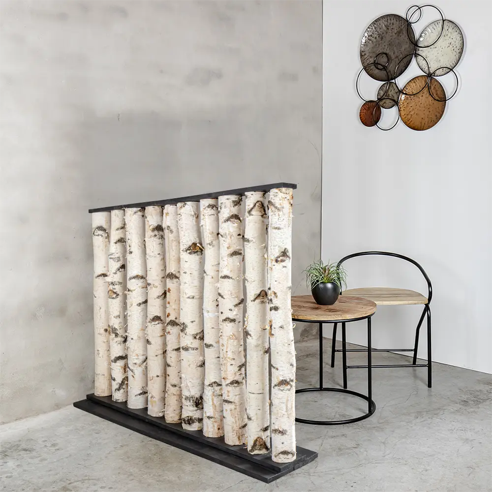 Der Raumteiler Thor bringt den robusten Charme von echten Birkenstämmen mit Rinde und dem modernen Look eines schwarzen Fußes zusammen. Das macht ihn zu einem perfekten Blickfang für alle, die einen natürlichen Look mit einem coolen Akzent mögen.