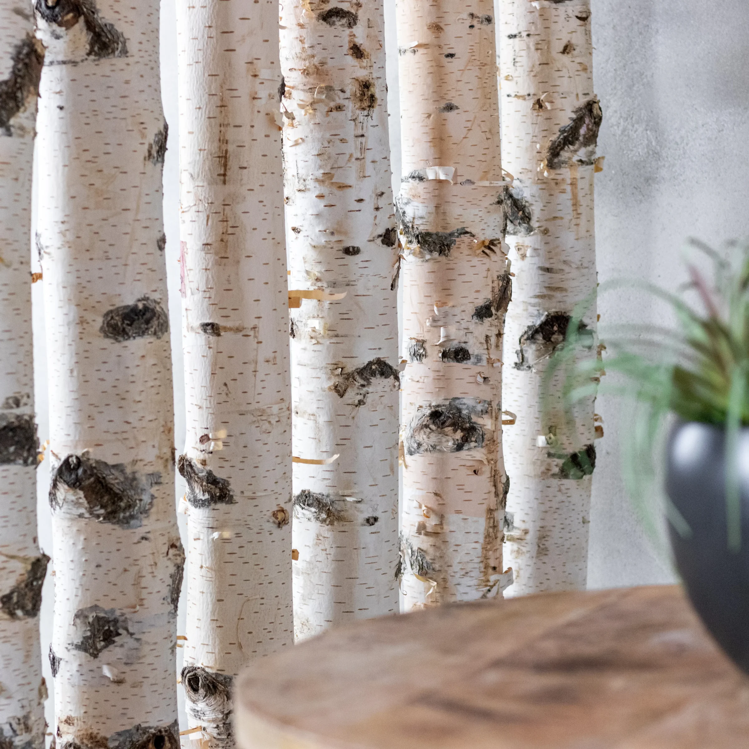Der Raumteiler Thor bringt den robusten Charme von echten Birkenstämmen mit Rinde und dem modernen Look eines schwarzen Fußes zusammen. Das macht ihn zu einem perfekten Blickfang für alle, die einen natürlichen Look mit einem coolen Akzent mögen.