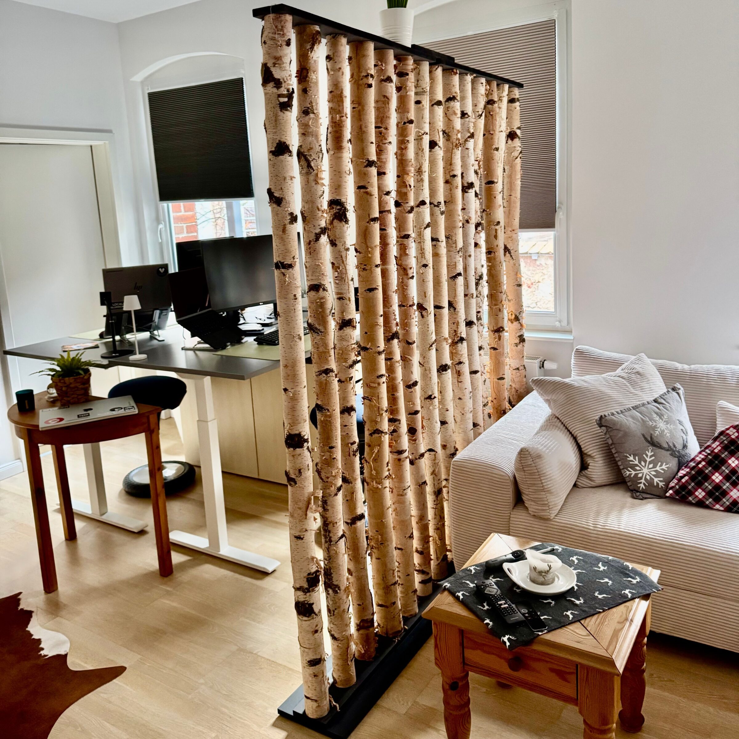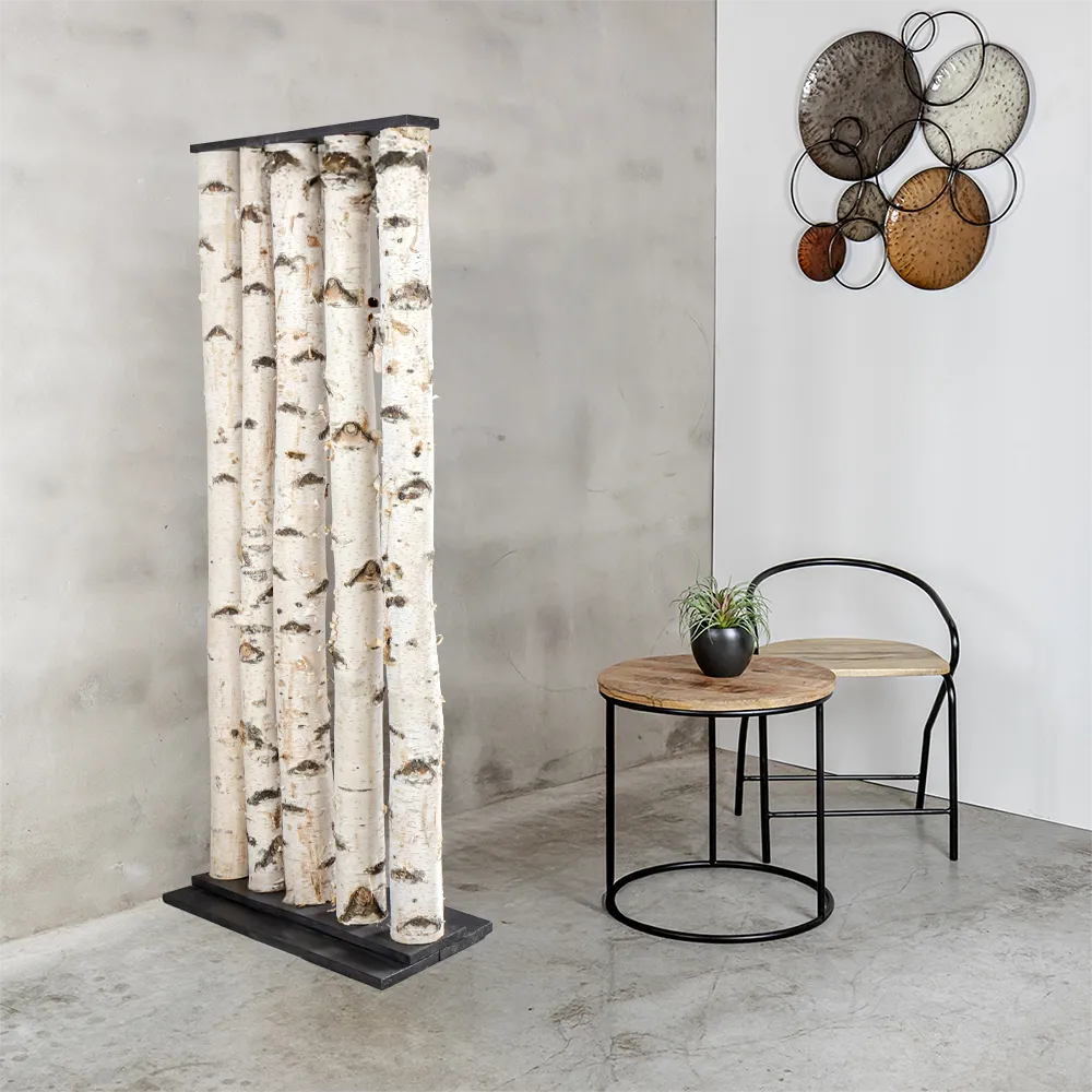 Der Raumteiler Thor bringt den robusten Charme von echten Birkenstämmen mit Rinde und dem modernen Look eines schwarzen Fußes zusammen. Das macht ihn zu einem perfekten Blickfang für alle, die einen natürlichen Look mit einem coolen Akzent mögen.