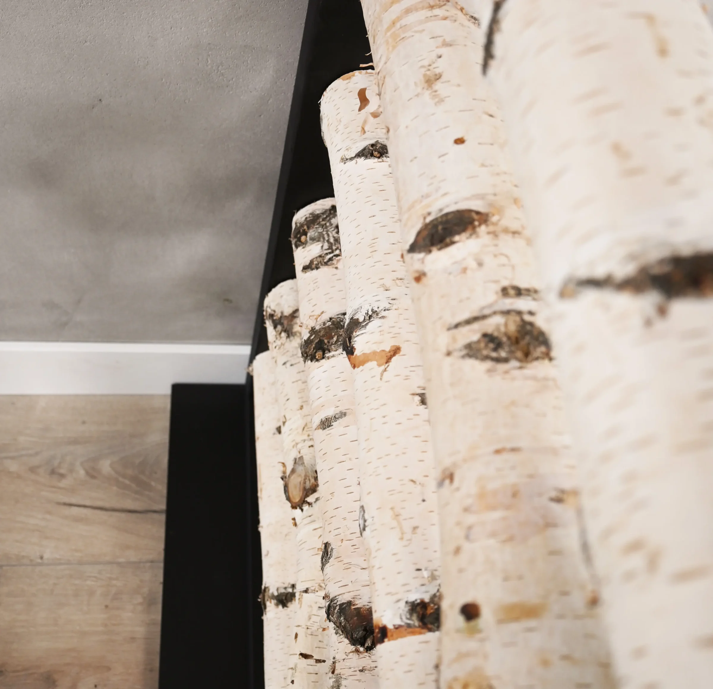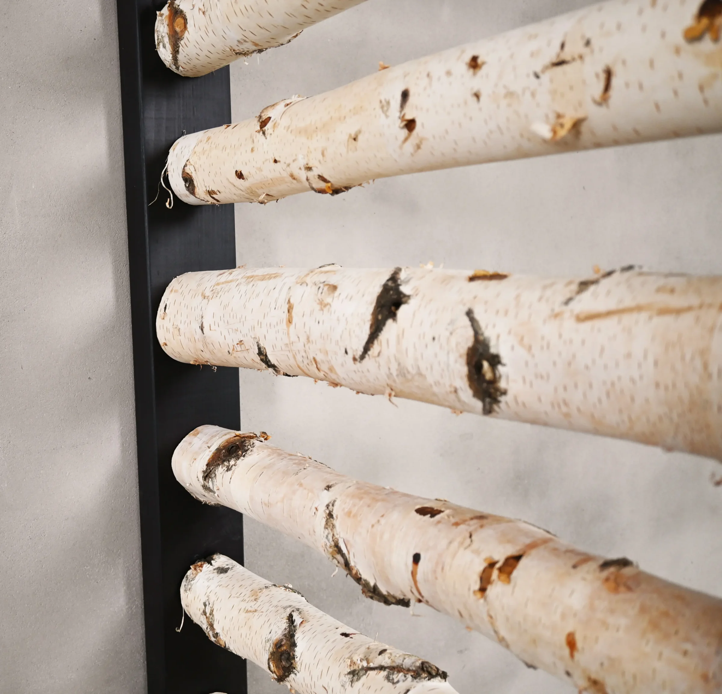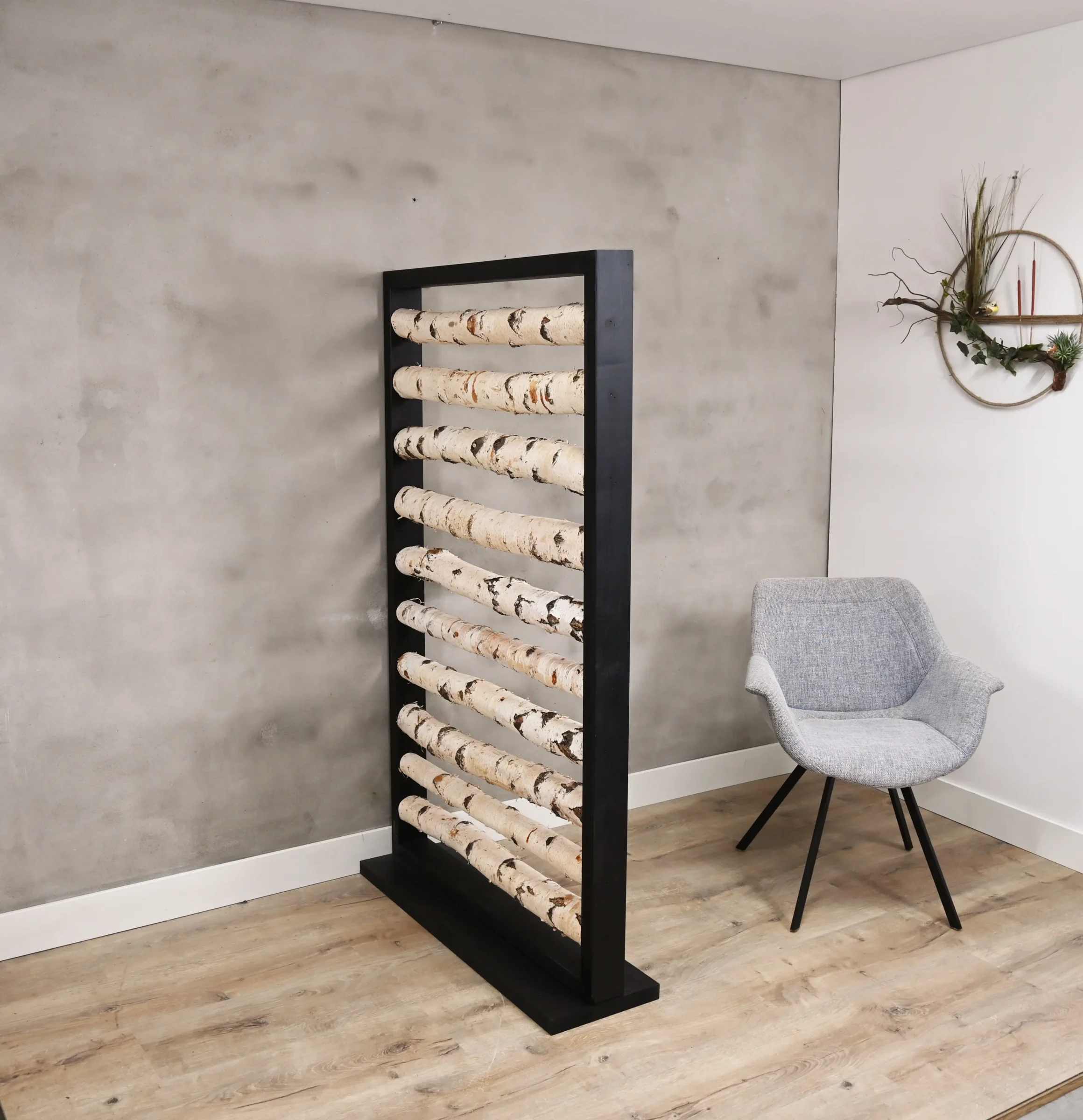 Der Raumteiler Thor ist ein echter Hingucker, der die Wärme von echten Birkenstämmen mit Rinde mit dem modernen Look eines schwarzen Rahmens verbindet. Die horizontal angeordneten Birkenstämme sorgen für einen verspielten und rhythmischen Effekt, während der robuste Rahmen einen klaren Kontrast und eine solide Ausstrahlung schafft.