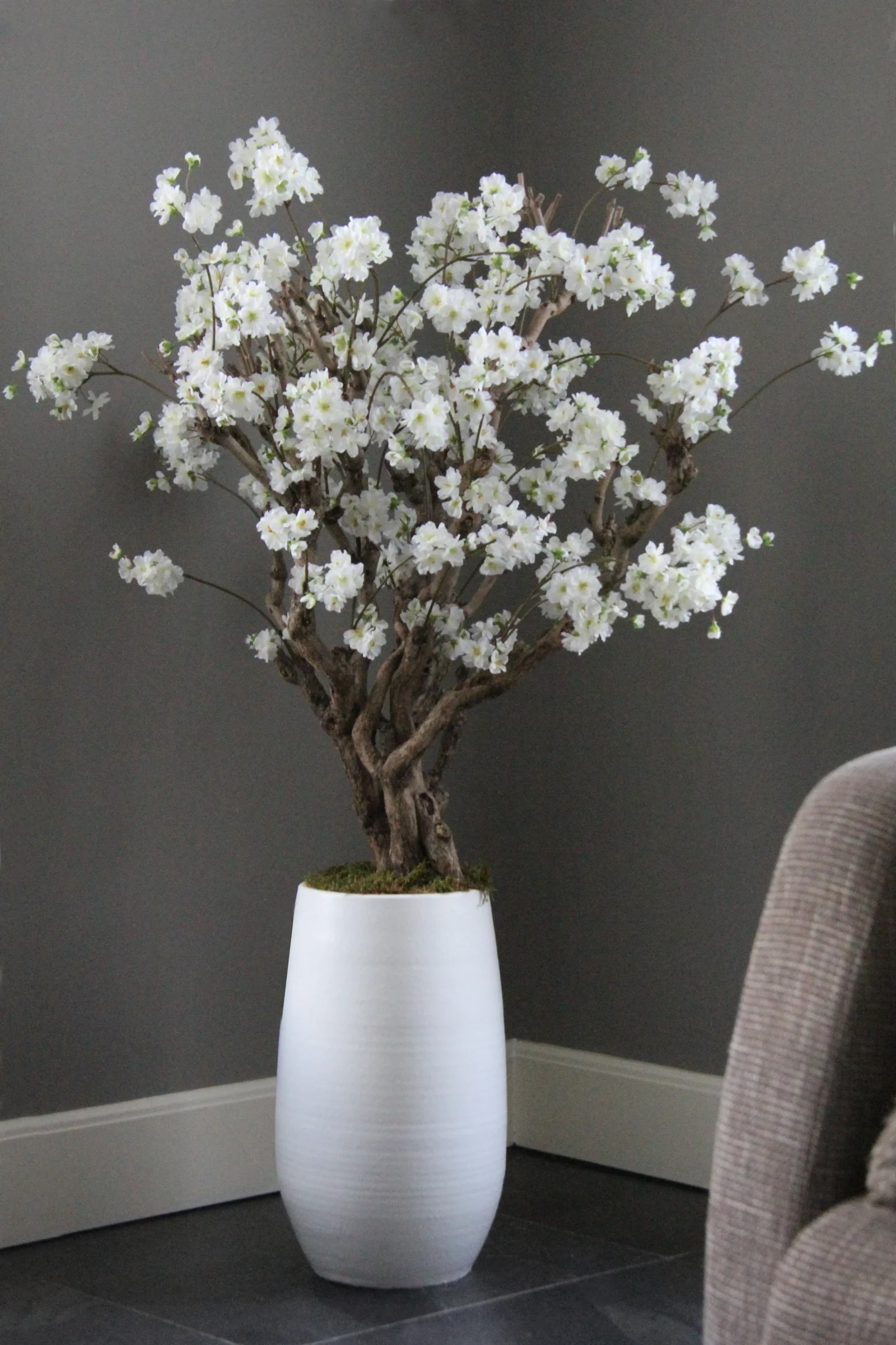 Möchtest du den Blütenbaum komplett geliefert bekommen? Das geht! Wir bieten auch große Keramik-Übertöpfe in Schwarz und Weiß an. Diese Töpfe haben ein schlichtes Design, das die natürliche Ausstrahlung des Baumes unterstreicht und gleichzeitig eine schicke, moderne Ergänzung für jedes Interieur darstellt. Perfekt für ein modernes Wohnzimmer oder einen stilvollen Büroraum.