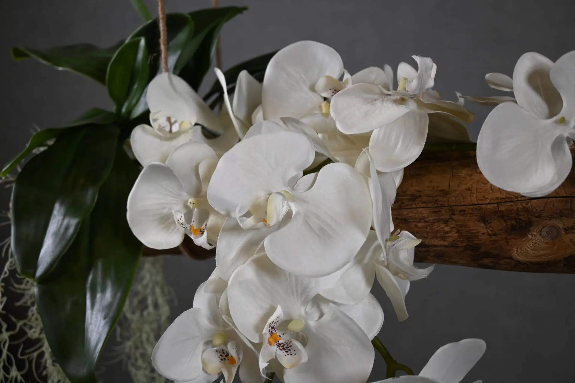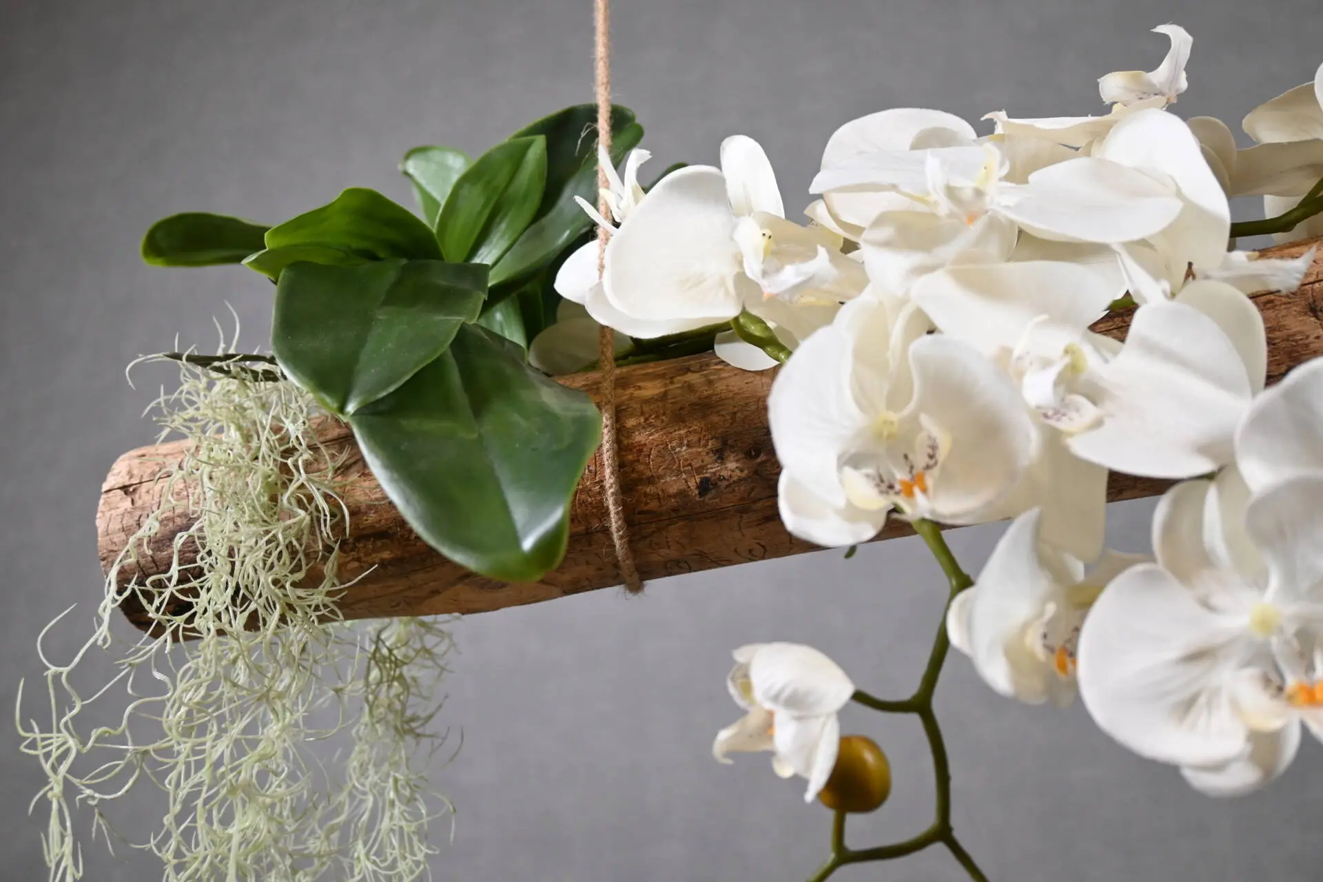 Dieser Baumstamm-Anhänger bringt eine natürliche und stilvolle Atmosphäre in dein Zuhause. Der robuste Holzstamm ist entrindet und zeigt eine schöne Kombination aus Kunstdekoration: naturgetreue Orchideen, frische grüne Blätter und hängendes Grünzeug.