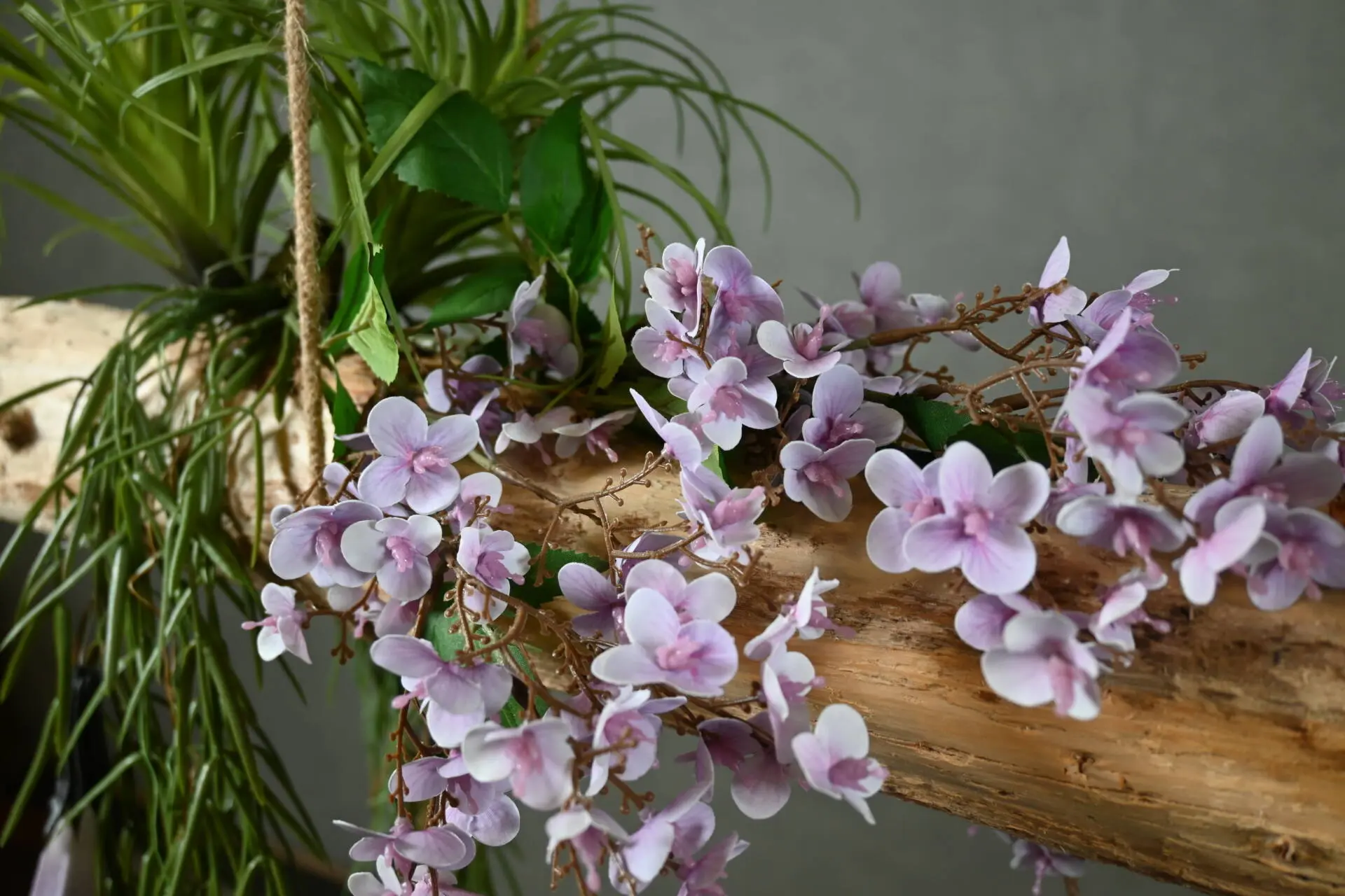 Verleihe deinem Interieur einen natürlichen und stimmungsvollen Look mit diesem Baumstamm-Anhänger. Der robuste Holzstamm ist wunderschön mit violetten künstlichen Stechapfelblumen und Wildrosenzweigen, Luftpflanzen und grünen Akzenten verziert. Ein echter Blickfang über dem Esstisch, im Wohnzimmer oder auch im Flur.