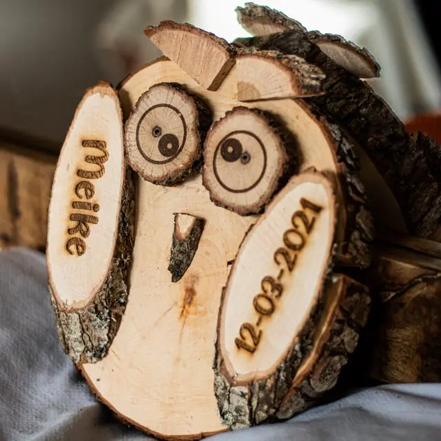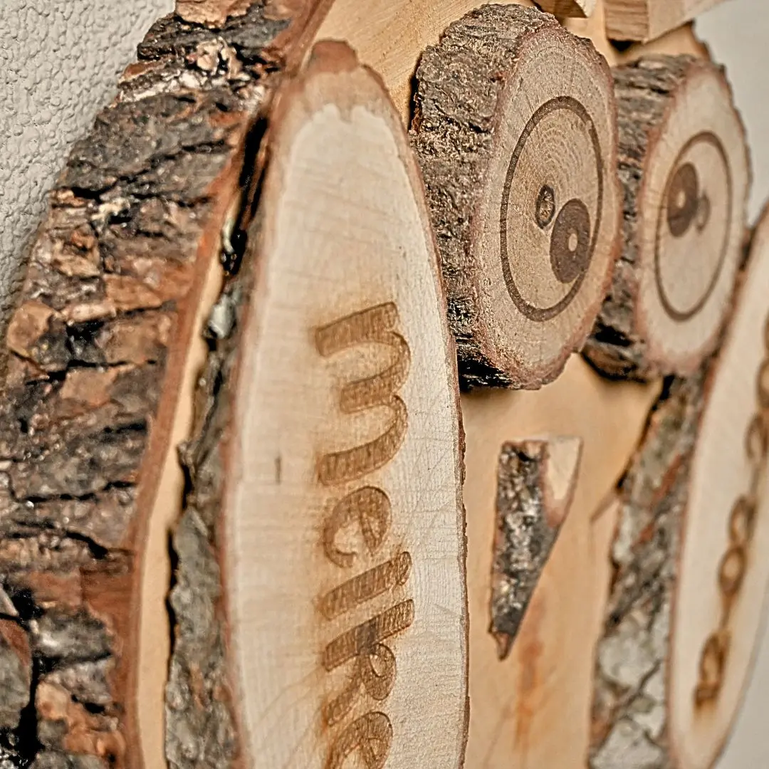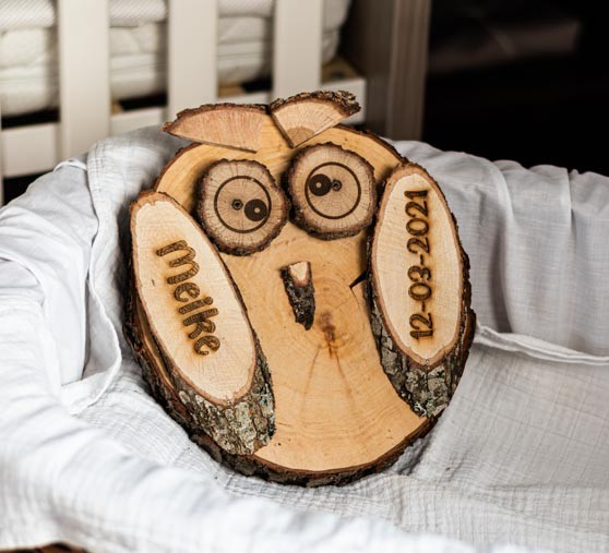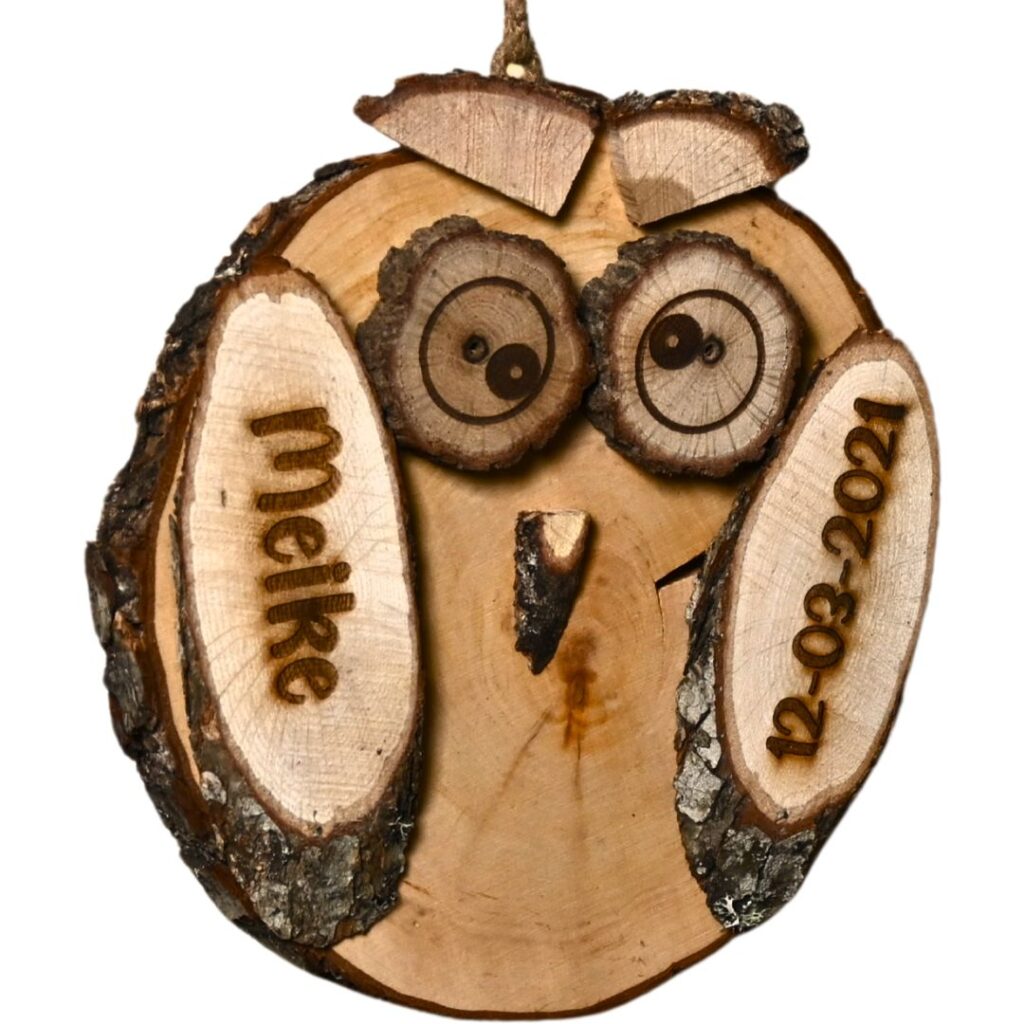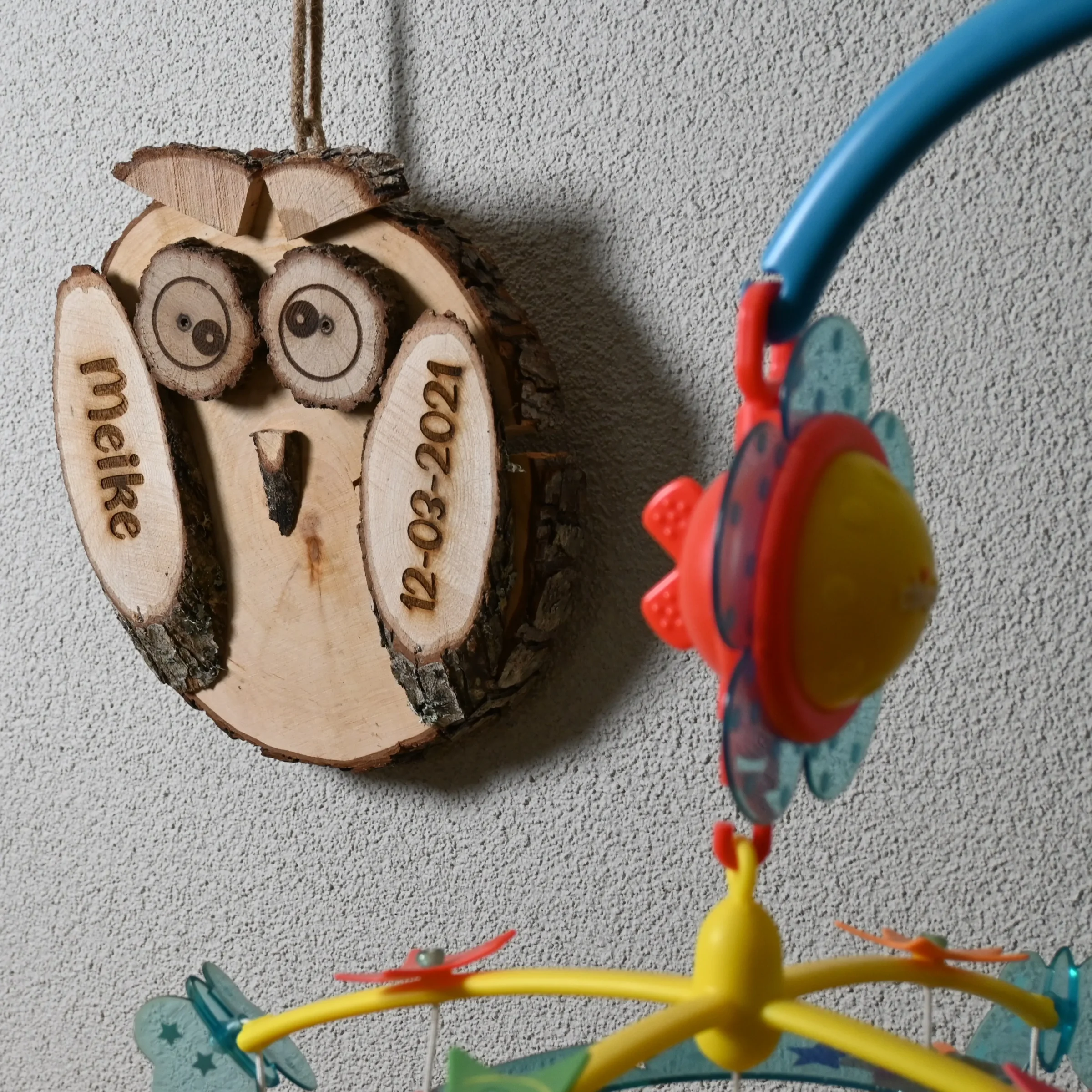 Diese niedliche kleine Holzeule ist aus echten Birkenscheiben handgefertigt, was ihr einen natürlichen und rustikalen Look verleiht. Der Bär kann ganz einfach mit der Schnur oben aufgehängt werden und ist ein attraktives Deko-Objekt für das Baby- oder Kinderzimmer, aber auch als Mutterschaftsgeschenk oder originelles Geschenk geeignet.