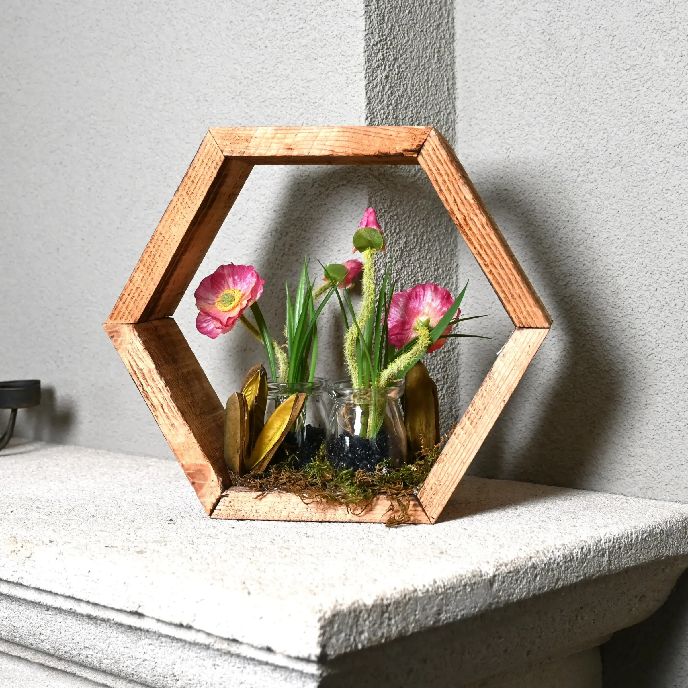 Diese Kunstpflanze in einem hölzernen Sechseck kombiniert klare Linien mit warmen, natürlichen Materialien. Die sechseckige Wanddekoration ist aus massivem Holz gefertigt und zeigt eine sorgfältig ausgewählte, lebensechte rosa Anemone in einer eleganten Glasvase. Das Ergebnis ist ein moderner und wartungsfreier Akzent, der mühelos in jedes Interieur passt – von skandinavisch bis industriell.