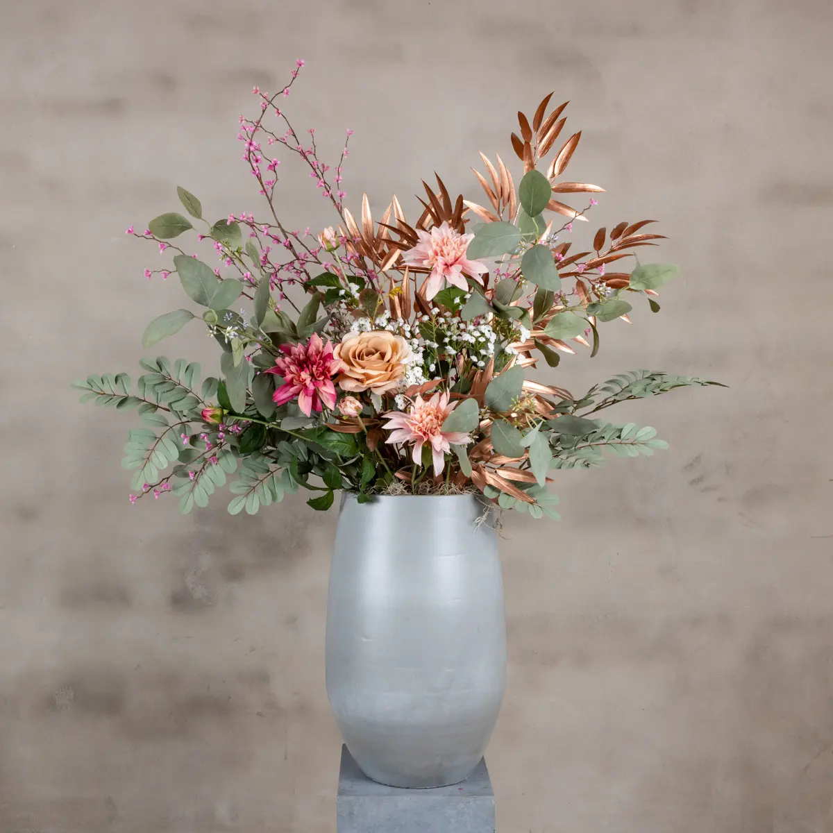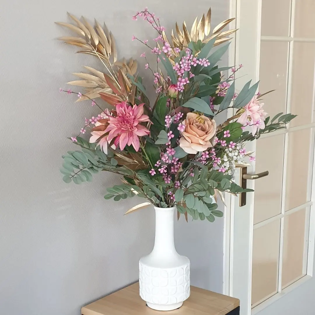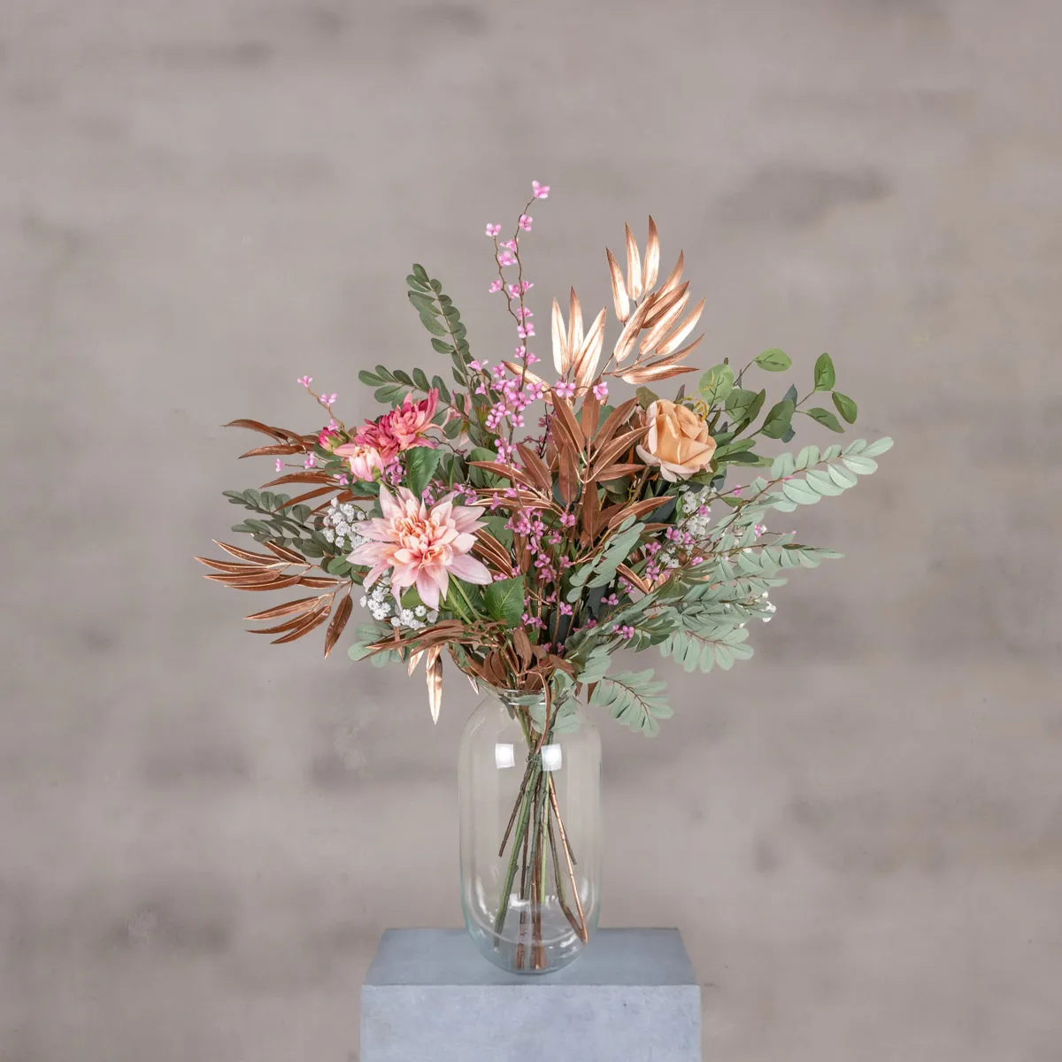 Der künstliche Blumenstrauß Chic kombiniert warme Töne mit luxuriösen Details. Die Mischung aus altrosa Blüten, goldenen Blättern, frischem Grün und dezenten Akzenten in Weiß und Rosa machen diesen Strauß zu einem echten Hingucker. Er strahlt Eleganz und Klasse aus und bringt sofort einen Hauch von Raffinesse in jedes Interieur.