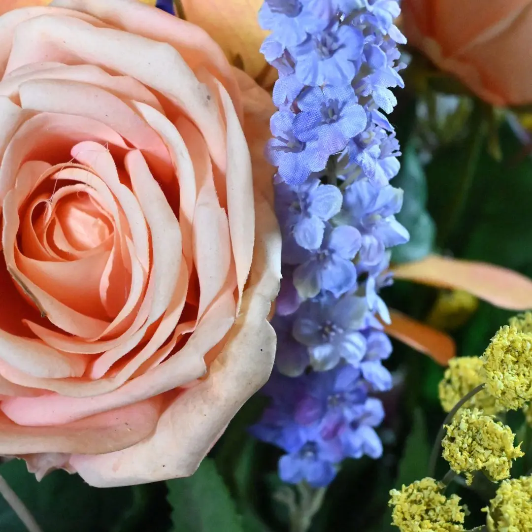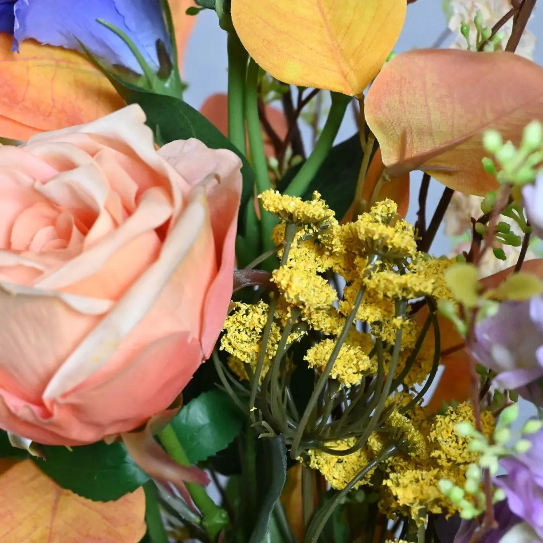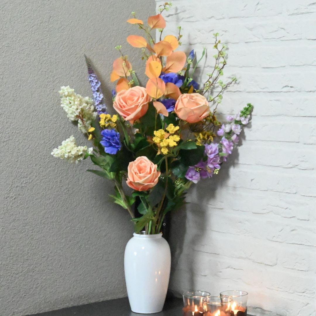 Der künstliche Strauß Farbenpracht ist eine üppige Komposition aus Blumen in Pfirsich, Lila, Blau, Gelb und frischem Grün. Die warmen Rosen in Pfirsichtönen werden mit lebendigen Akzenten und subtilen Zweigen kombiniert und verleihen diesem Strauß einen dynamischen Look. Ein echter Stimmungsmacher, der in moderne, farbenfrohe und kreative Innenräume passt.