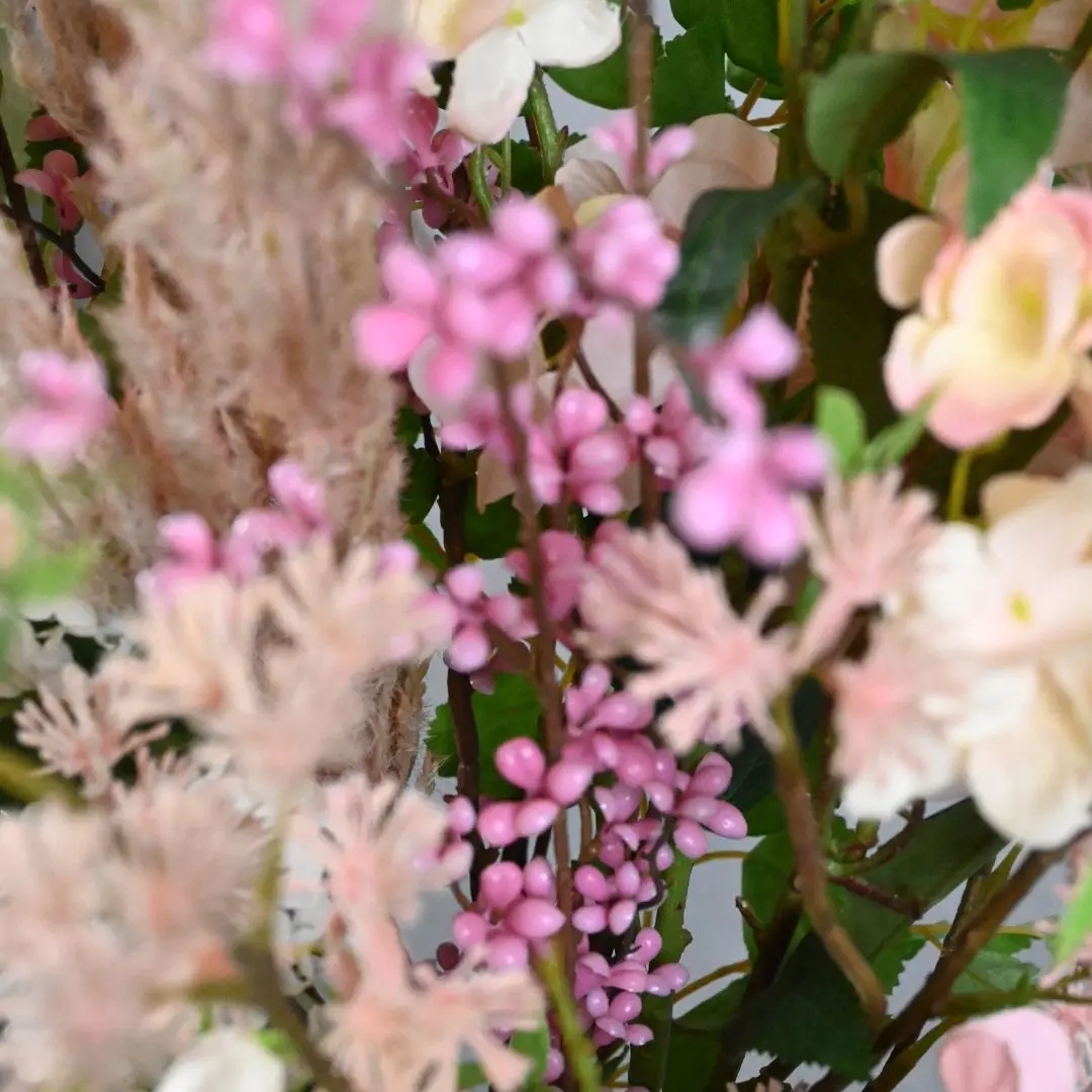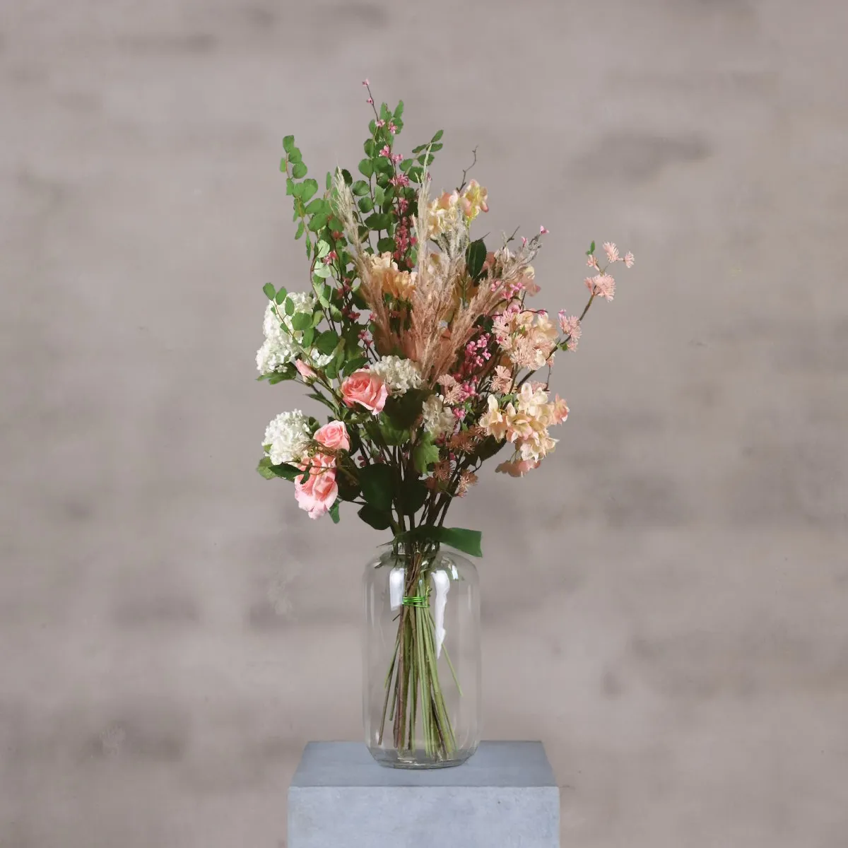 Der künstliche Blumenstrauß Morning Tau bringt eine frische, leichte Atmosphäre in dein Zuhause. Die Kombination aus sanften Pastelltönen wie Rosa, Pfirsich und Creme mit frischem Grün und luftigen Gräsern schafft einen eleganten, natürlichen Look. Dieser Strauß strahlt das Gefühl eines frühen Frühlingstages aus und verleiht jedem Interieur einen Hauch von Ruhe und Raffinesse.
