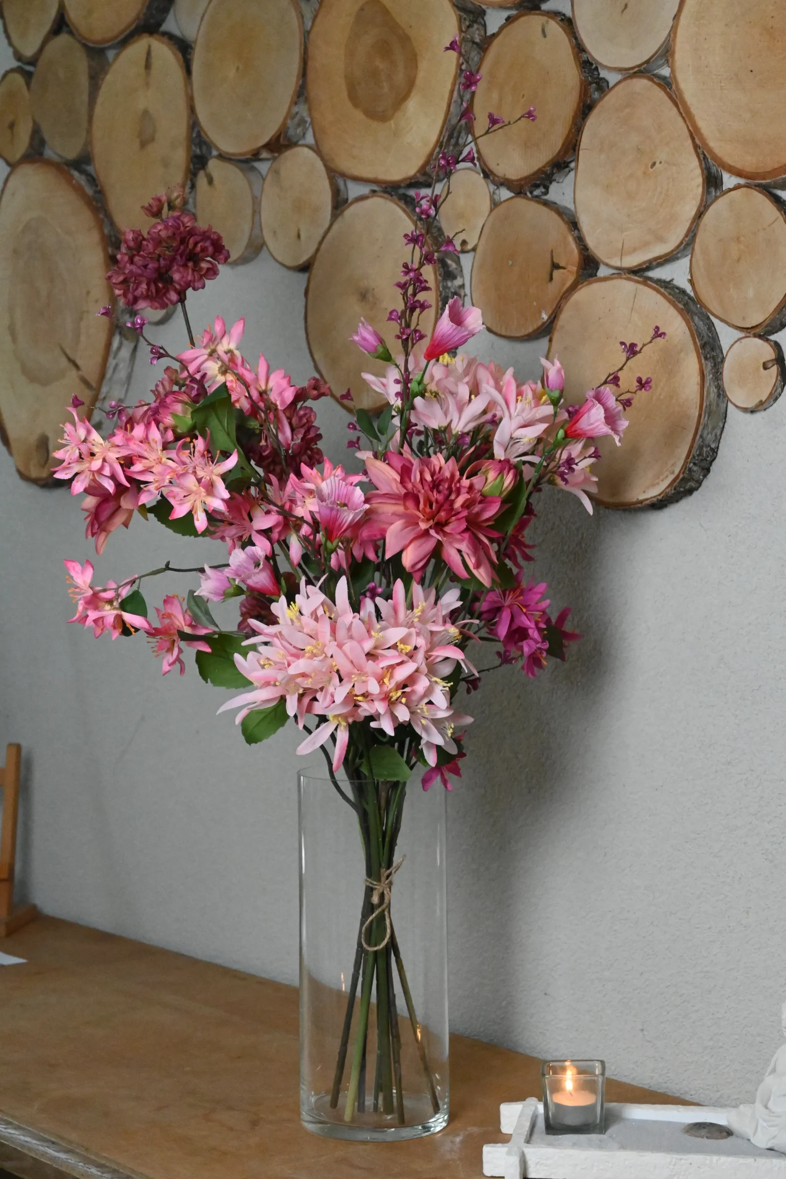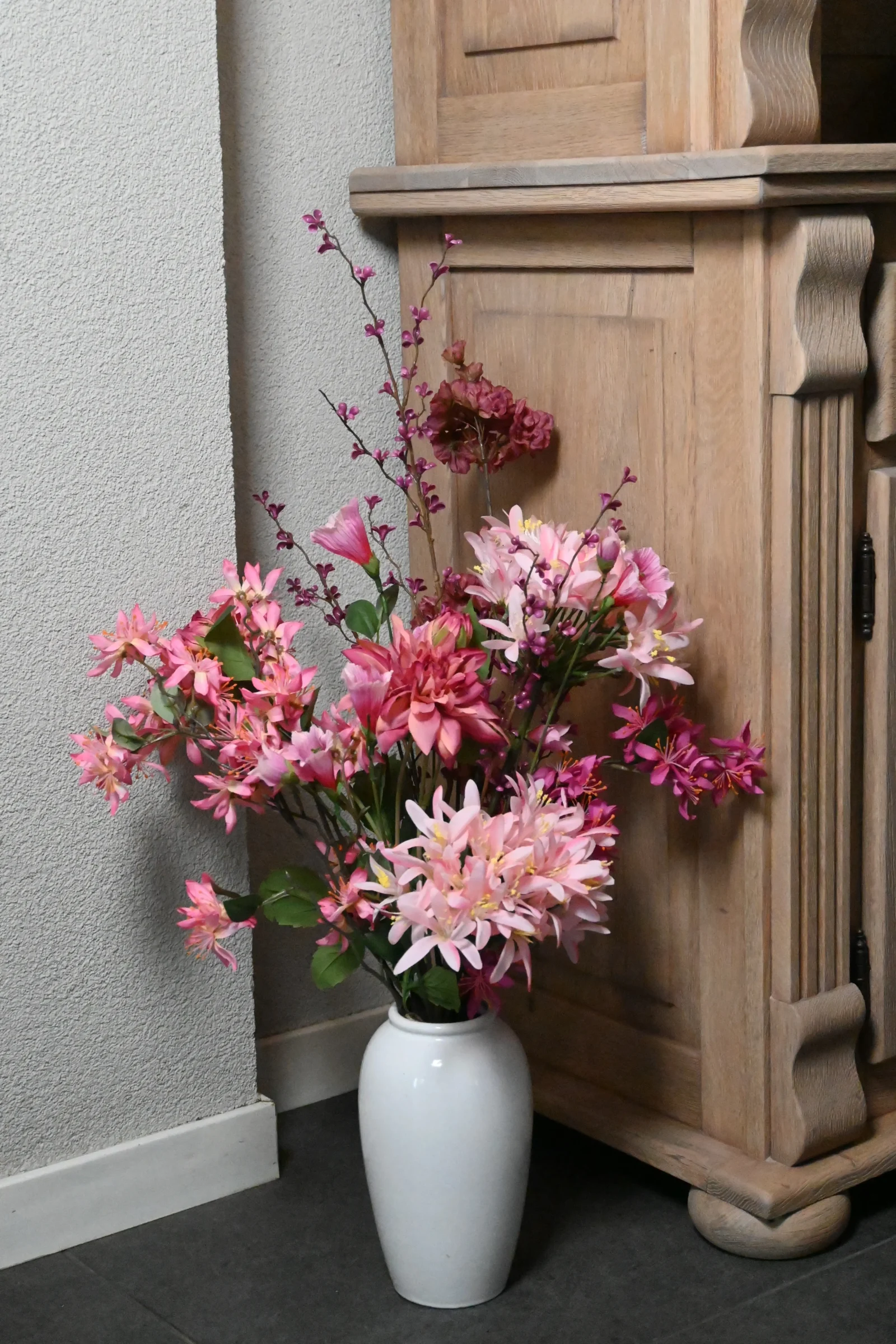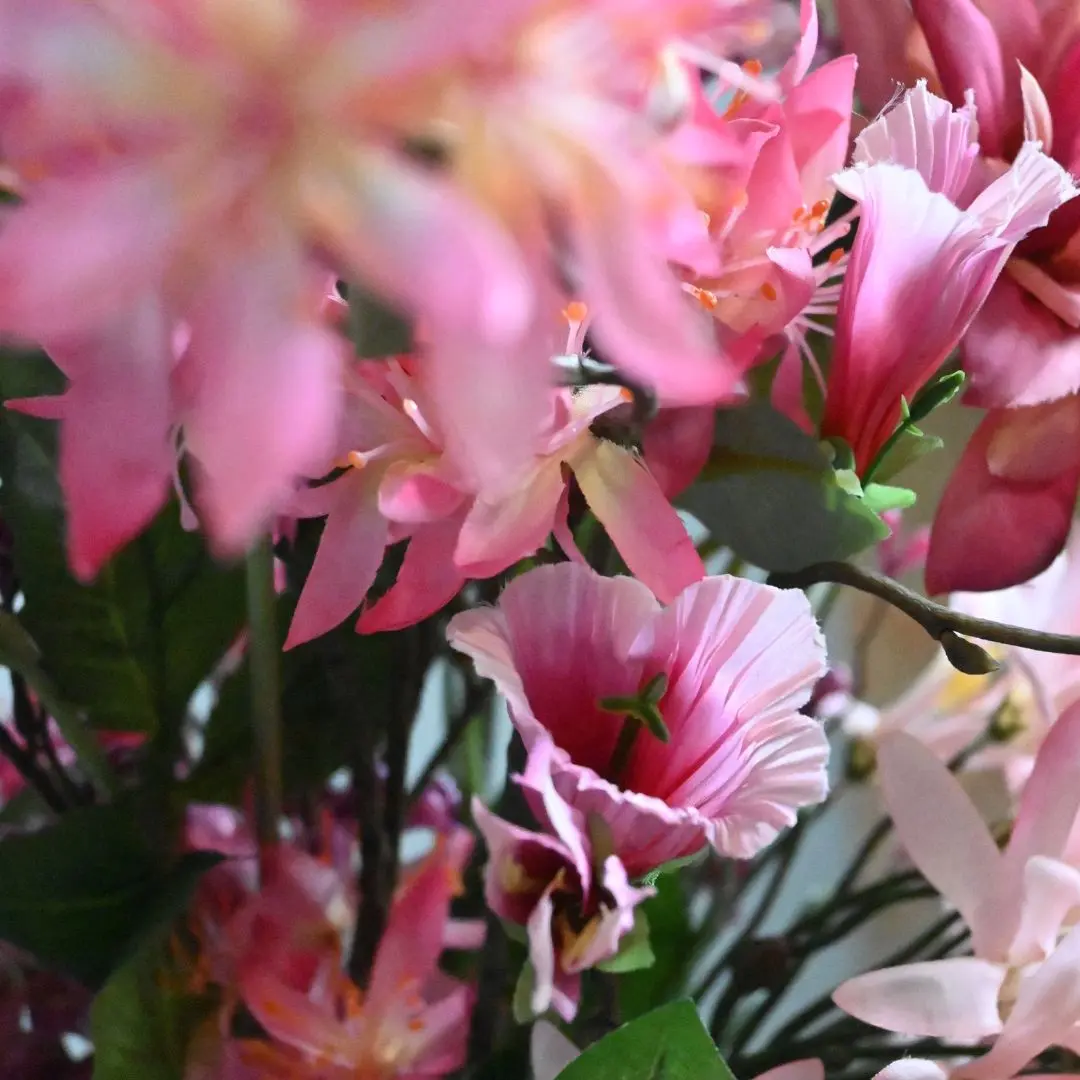 Der künstliche Blumenstrauß Passion strahlt Wärme und Eleganz durch die harmonische Kombination von rosa, fuchsiafarbenen und violetten Blumen aus. Die vollen Blütenköpfe kombiniert mit schlanken Zweigen sorgen für einen raffinierten und verspielten Look. Dank der hochwertigen Verarbeitung sehen die Blumen natürlich aus und du wirst dich jahrelang an einem schönen Strauß erfreuen, der nie verwelkt.
