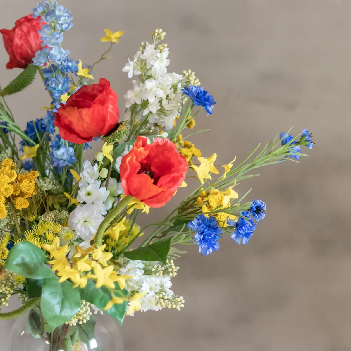 Der künstliche Blumenstrauß Feldblumen verströmt den Charme einer Sommerwiese. Mit der lebendigen Kombination aus rotem Mohn, gelben Akzenten, blauen Kornblumen und weißen blühenden Details sieht es so aus, als hättest du bei einem Spaziergang durch die Natur deinen eigenen Strauß gepflückt. Die verspielten Farben und Formen bringen sofort Gemütlichkeit und einen Hauch von Natur ins Haus.