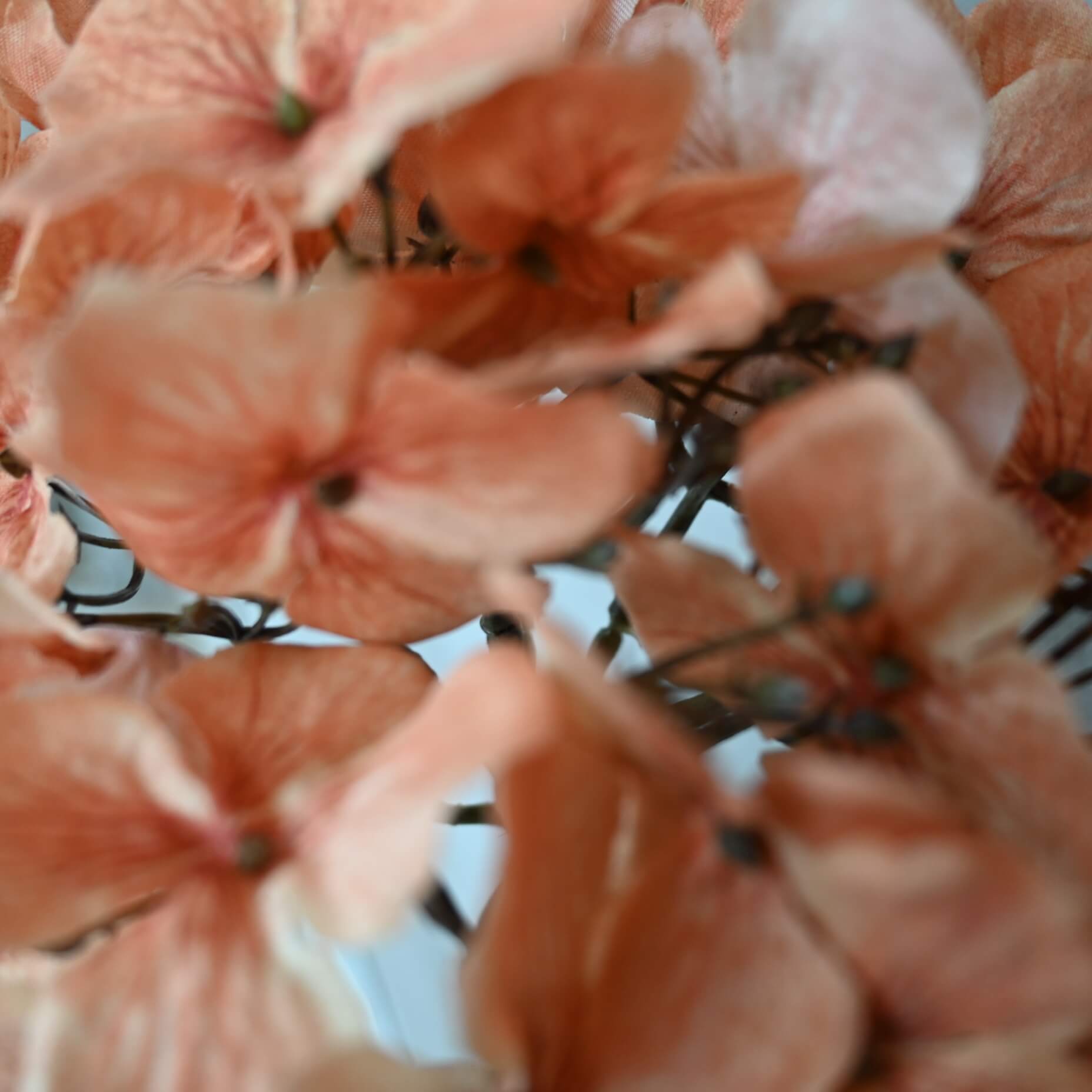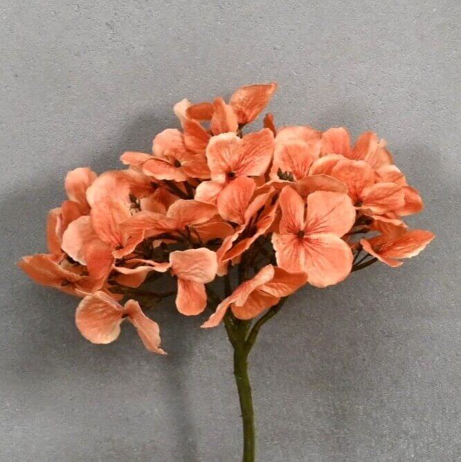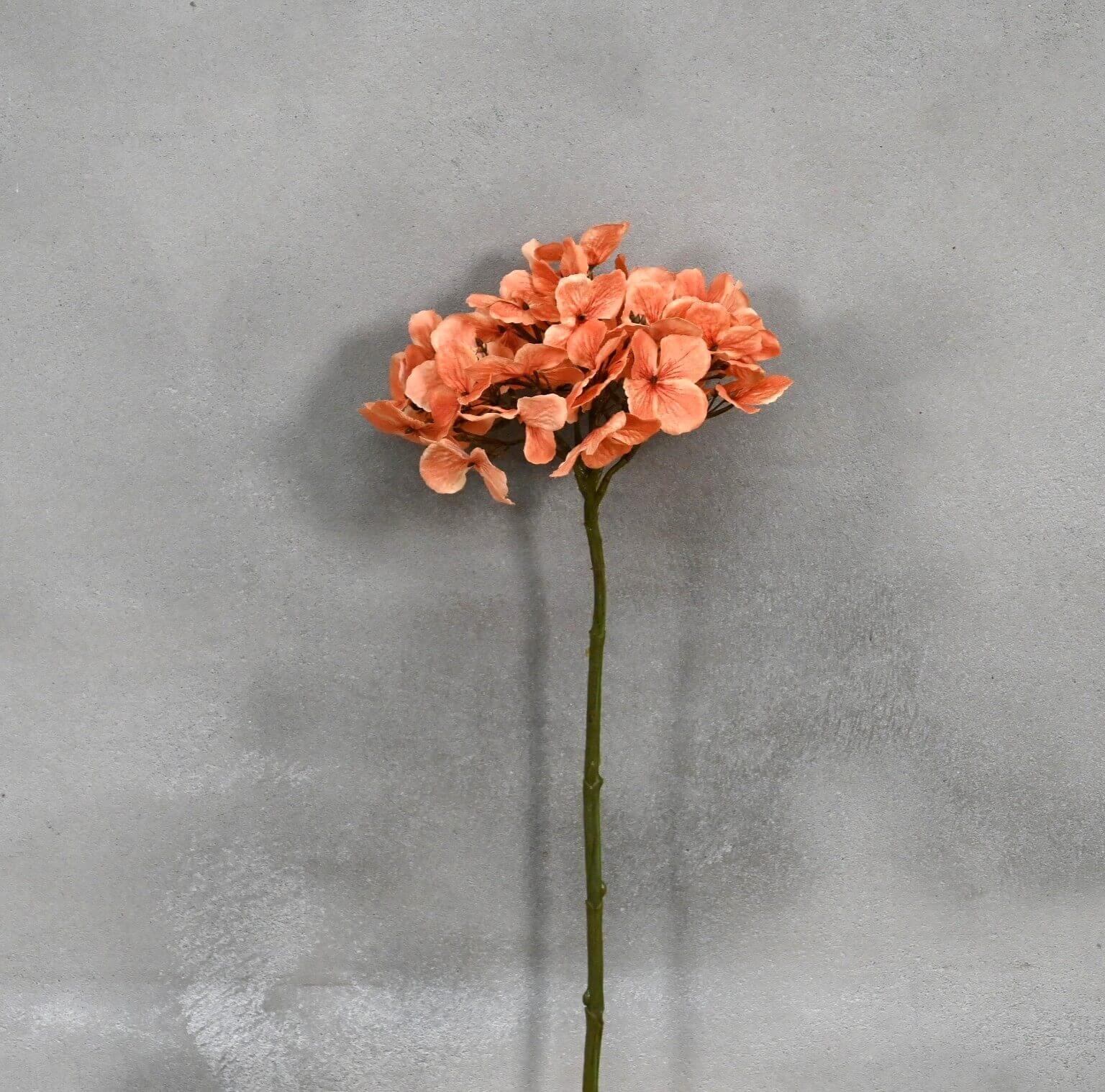 Diese wilde Kunst-Hortensienblüte in einem warmen Orange setzt einen verspielten und natürlichen Akzent in jeder Einrichtung. Mit ihren gefüllten Blüten und der leichten Verzweigung sieht der Zweig lebensecht und stilvoll aus.