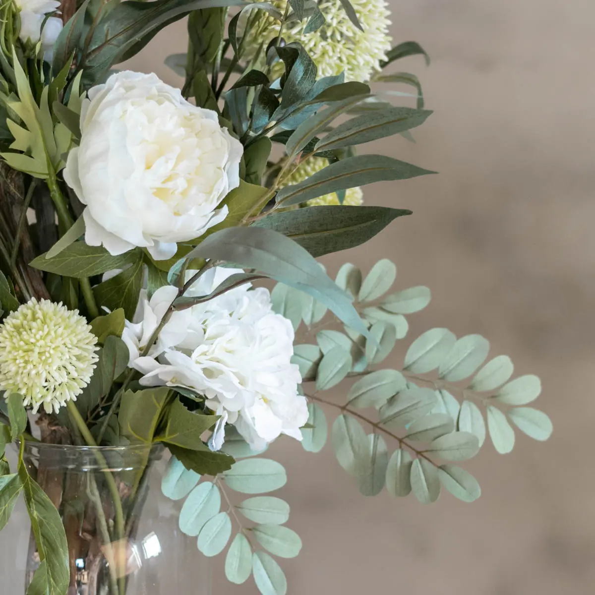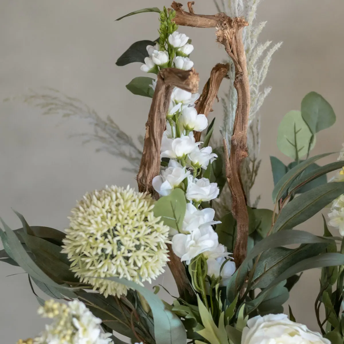 Mit einer Höhe von 80 cm ist dieser künstliche Strauß ideal für eine hohe Vase auf einem Tisch, einem Sideboard oder als auffälliger Blickfang in einem Empfangsbereich. Durch die neutralen Farben passt dieser Strauß zu jeder Einrichtung: von modern und minimalistisch bis hin zu ländlich und romantisch.
