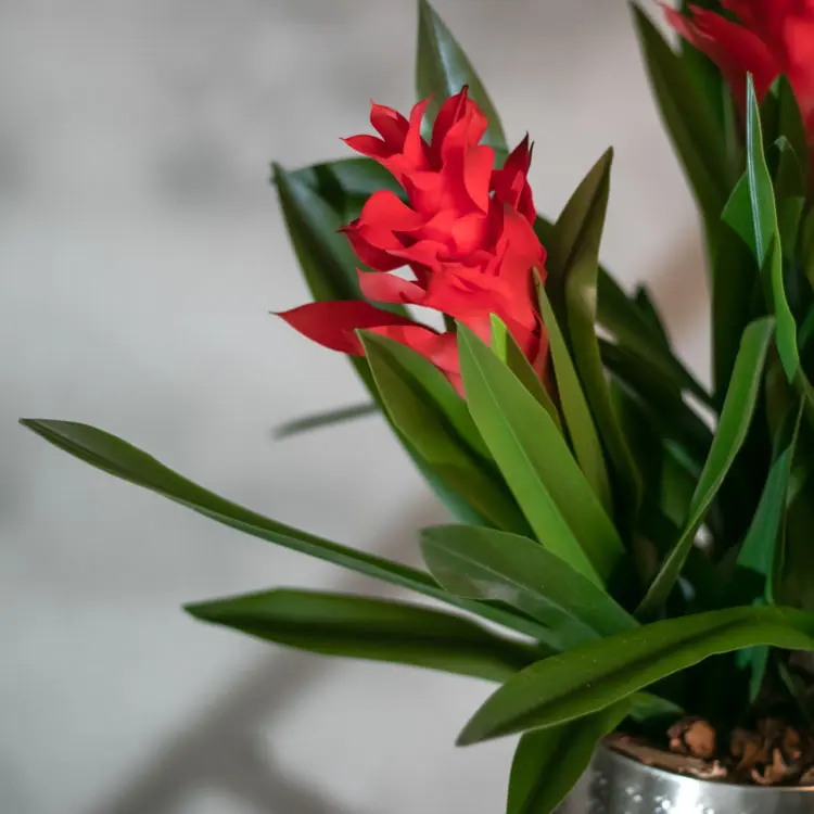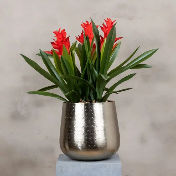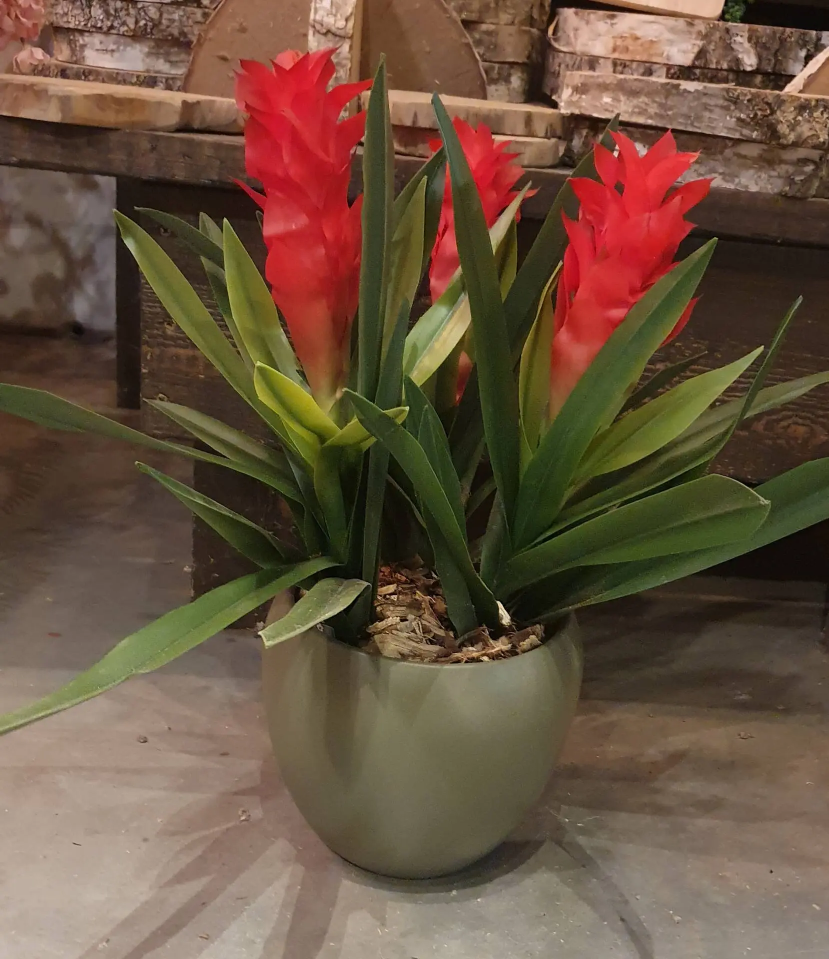 Hol dir mit diesem künstlichen Blumenarrangement Bromelia einen exotischen und farbenfrohen Blickfang ins Haus. Die Kombination aus tiefgrünen Blättern und leuchtend roten Blüten sorgt sofort für ein tropisches Flair.
