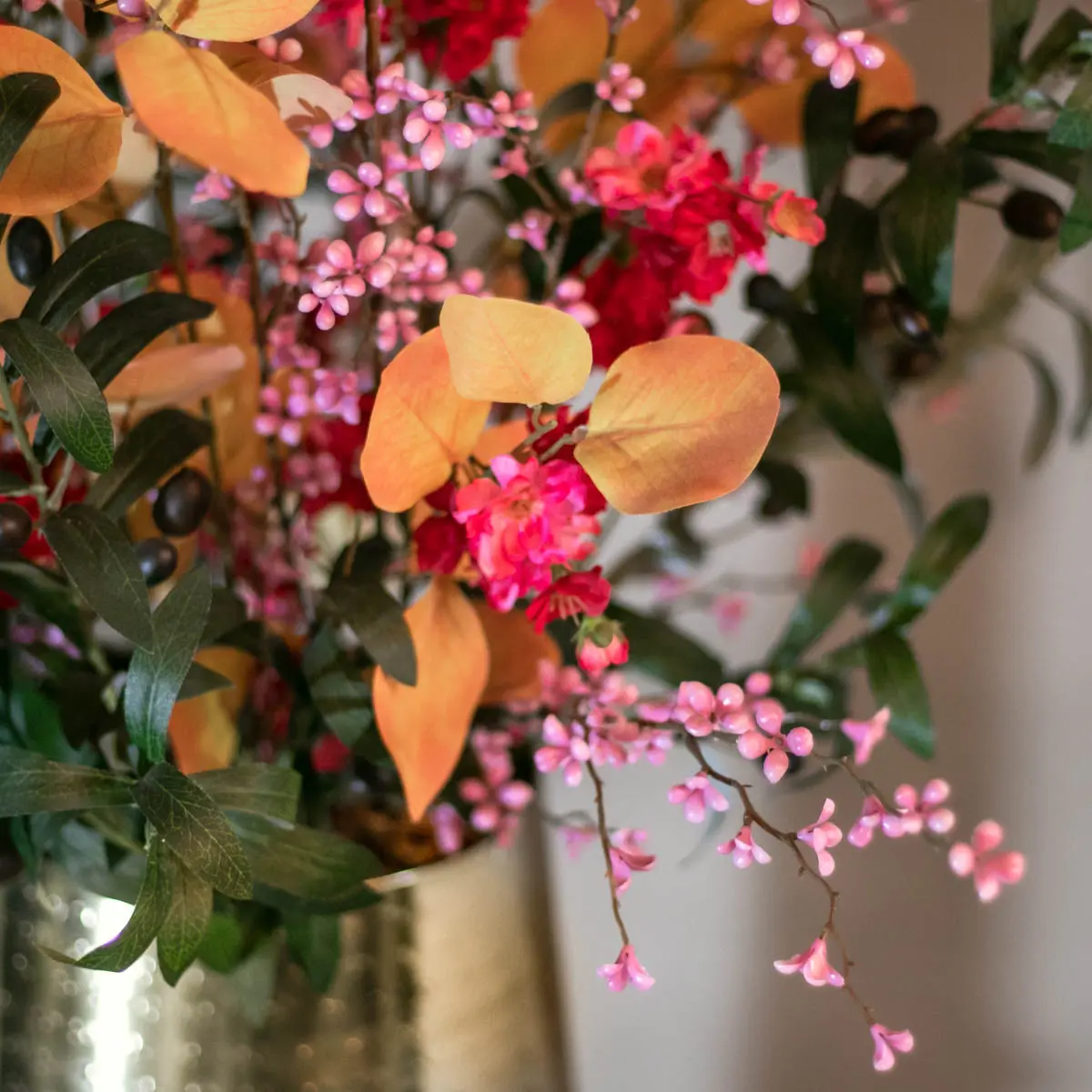 Bring Farbe und Wärme in dein Zuhause mit dem Kunstblumenarrangement Nora. Dieses Arrangement kombiniert fuchsiafarbene Blumen mit frischen rosa Akzenten und auffälligen goldgelben Blättern. Die Mischung der Farben sorgt für einen lebendigen und verspielten Look, perfekt für alle, die einen echten Blickfang in ihrem Zuhause wollen.