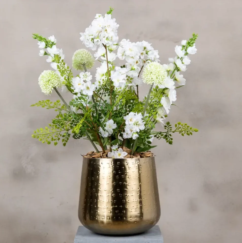 Das Blumenarrangement wird standardmäßig in einem Innenbehälter geliefert, kann aber auch mit einer großen Auswahl an Übertöpfen bestellt werden, wodurch es nicht nur natürlich aussieht, sondern auch eine schicke und moderne Ergänzung für jedes Interieur ist. Dank der hochwertigen Kunstmaterialien bleibt dieses Stück jahrelang schön, ohne Pflege oder Wasser.
