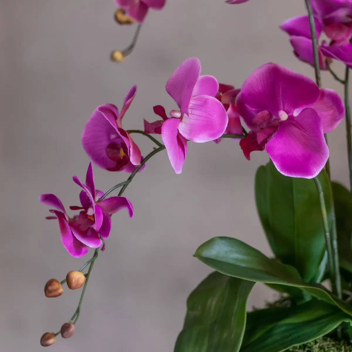 Bring dein Zuhause mit diesem eleganten Kunstblumenarrangement Romy zum Strahlen. Die wunderschönen violetten Orchideen sorgen für einen luxuriösen und stimmungsvollen Look und bringen sofort Wärme und Stil in dein Zuhause.