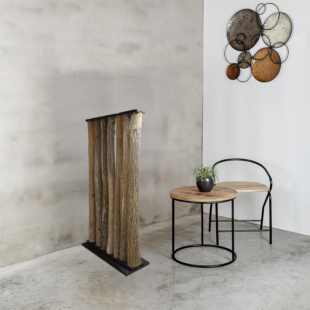 Die Stämme sind fest in einem schwarzen Sockel verankert, der für Stabilität sorgt und einen stilvollen Kontrast zum natürlichen Holz bildet. Diese Kombination macht den Raumteiler sowohl für ländliche Interieurs als auch für moderne Räume geeignet, in denen ein robuster, organischer Blickfang gewünscht ist.