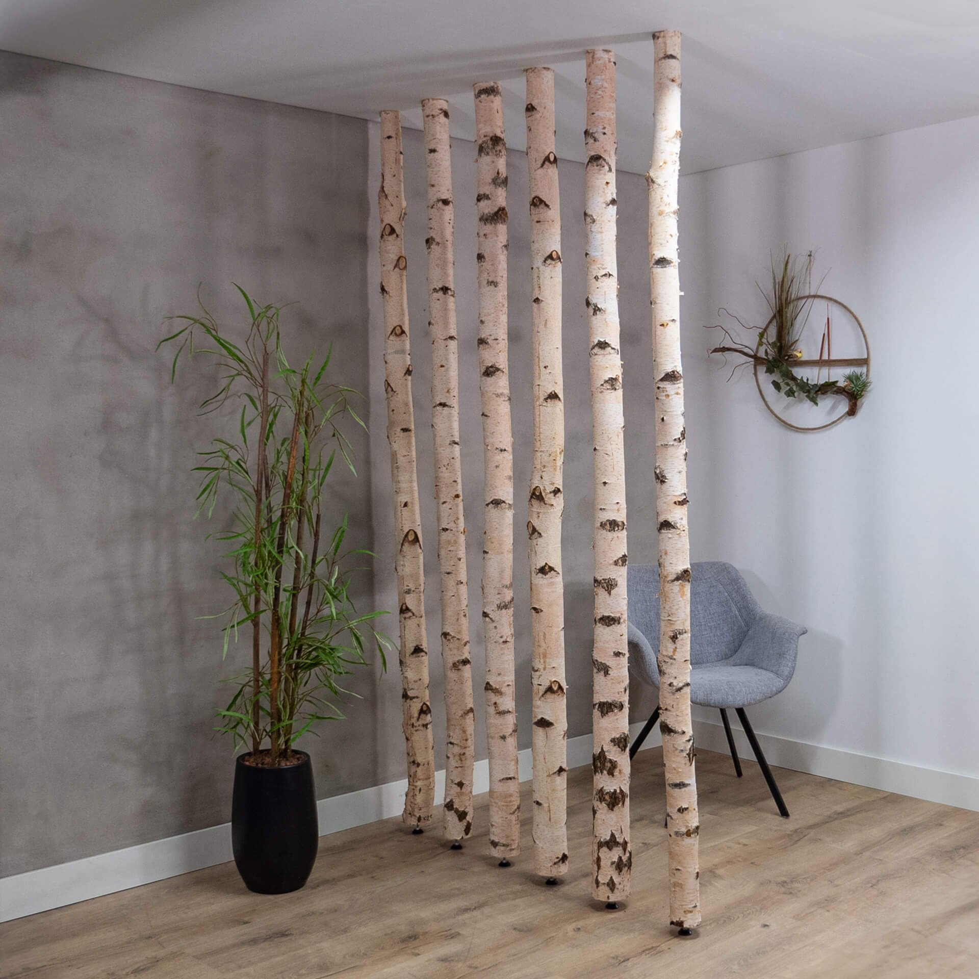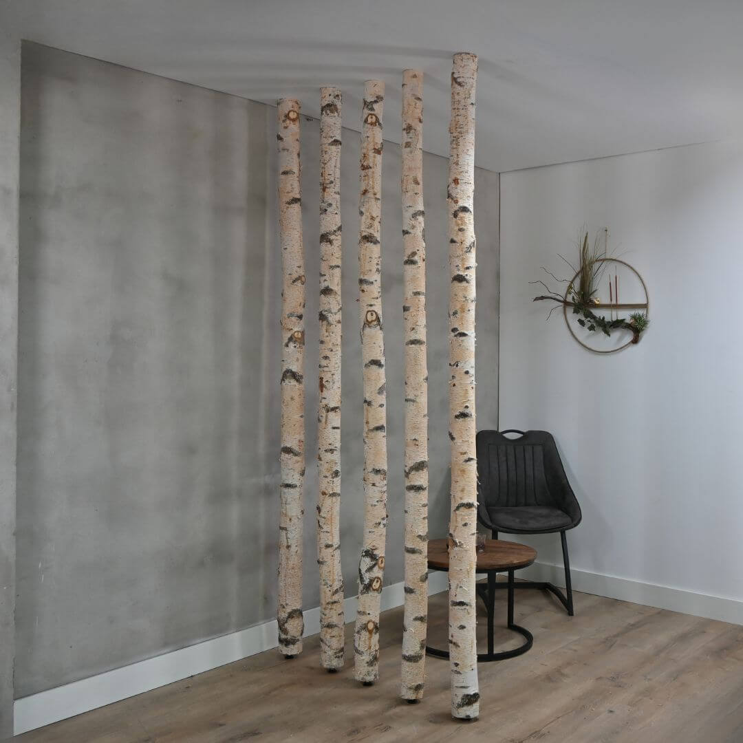 Mach dir ganz einfach eine natürliche Trennwand oder eine coole Deko mit diesen echten Birkenstämmen mit Einstellschraube. Jeder Stamm wurde sorgfältig nach seiner natürlichen Form und seiner coolen Rindenstruktur ausgewählt, was jedem Raum einen warmen, rustikalen Look verleiht.
