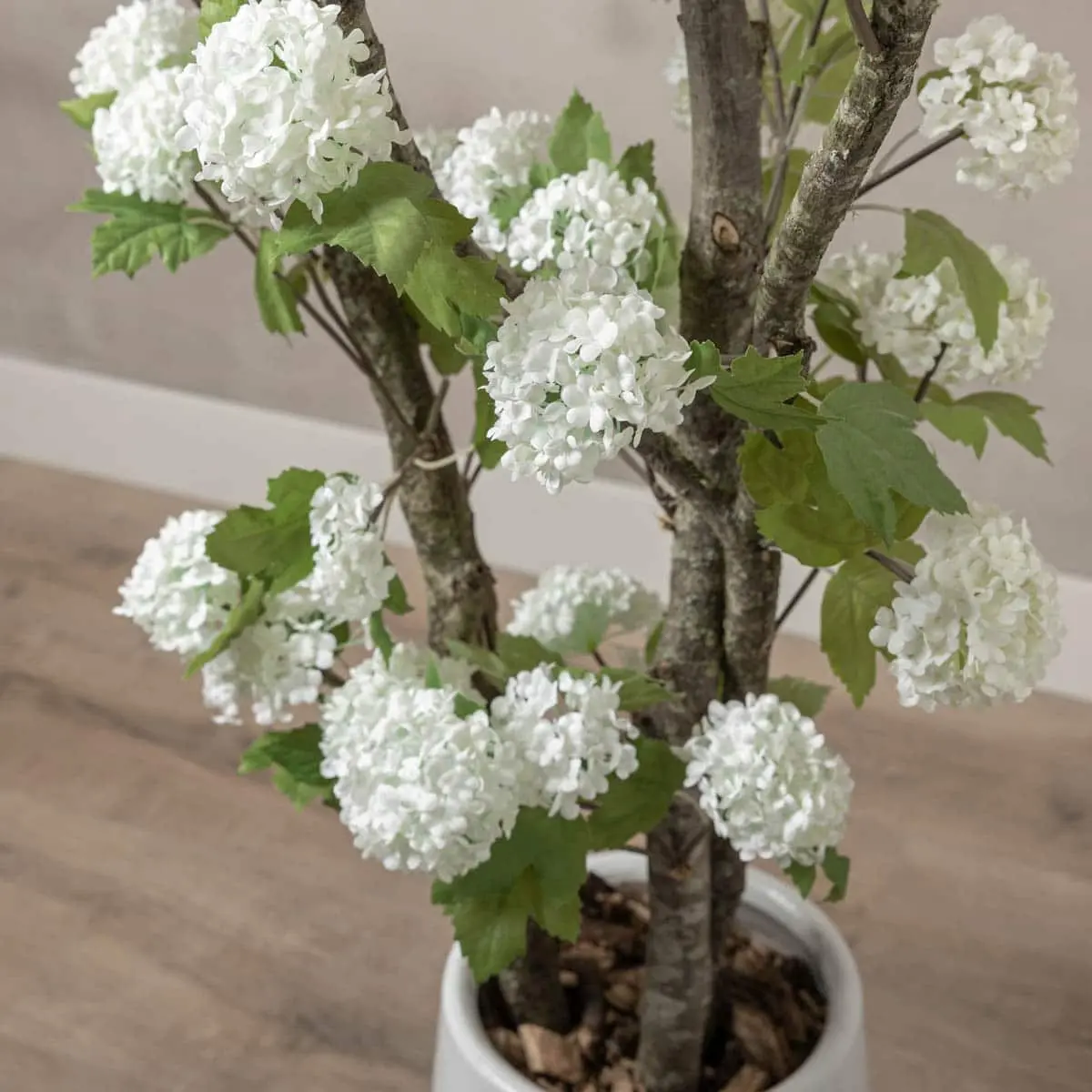 Der robuste Stamm hat eine natürliche Holzstruktur, wodurch der Baum echt aussieht und perfekt in moderne und ländliche Innenräume passt. Die Blüten sind aus hochwertigem Kunstmaterial gefertigt und haben dezente Farbakzente im Herzen jeder Blüte für einen besonders realistischen Effekt.