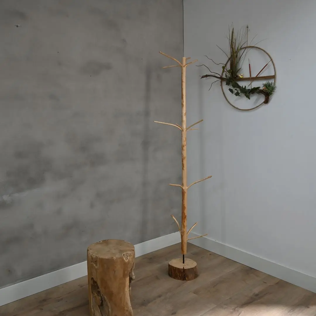 Der Stamm ist unbehandelt und matt veredelt, wodurch die warme Farbe und die feine Holzmaserung wunderschön zur Geltung kommen. Der robuste Fuß sorgt für Stabilität, während die natürlichen Verzweigungen ideal zum Aufhängen von Jacken, Schals oder Accessoires sind.