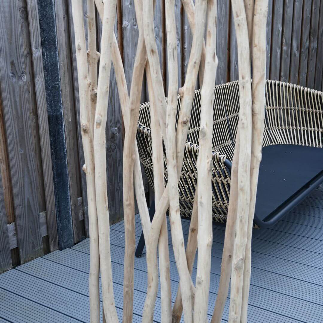 Dieser stylische Raumteiler aus der Jorn-Serie ist aus massivem Teakholz gemacht – einem nachhaltigen Hartholz mit einem warmen, natürlichen Look. Die schlanken Stämme wurden sorgfältig ausgewählt und auf einem natürlichen Holzfuß platziert, sodass der Raumteiler stabil steht und trotzdem einen luftigen Eindruck macht.