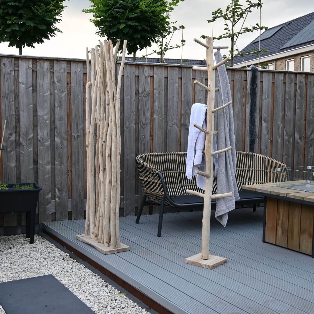 Das natürliche Teakholz passt gut zu Holzböden, Gartenmöbeln und Pflanzen, sodass sich der Raumteiler harmonisch in jede Umgebung einfügt.