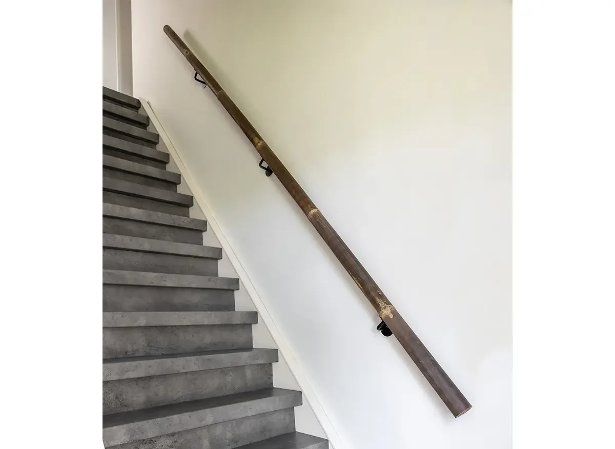 Der Handlauf wird sorgfältig nach Form, Festigkeit und Farbe ausgewählt und anschließend glatt geschliffen, um ein angenehmes und sicheres Griffgefühl zu gewährleisten. Jeder Bambusstab ist ein Unikat – mit natürlichen Abweichungen in Struktur und Durchmesser, die für ein authentisches, lebendiges Aussehen sorgen.