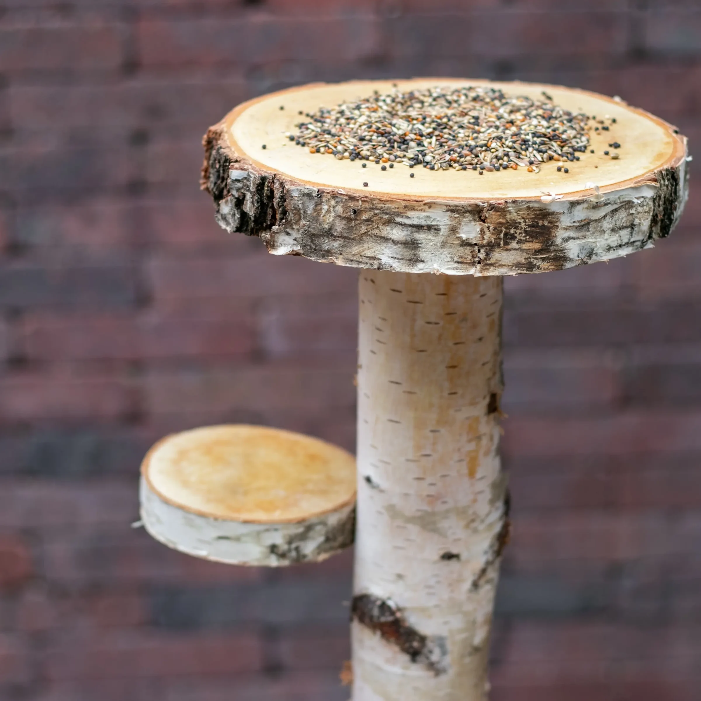 Vogelbaum Charlie aus einem Birkenstamm mit 3 Sitzplätzen und einer Futterschale, Höhe 75 cm.