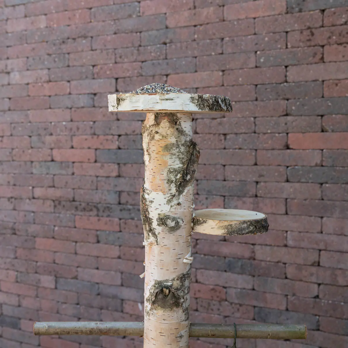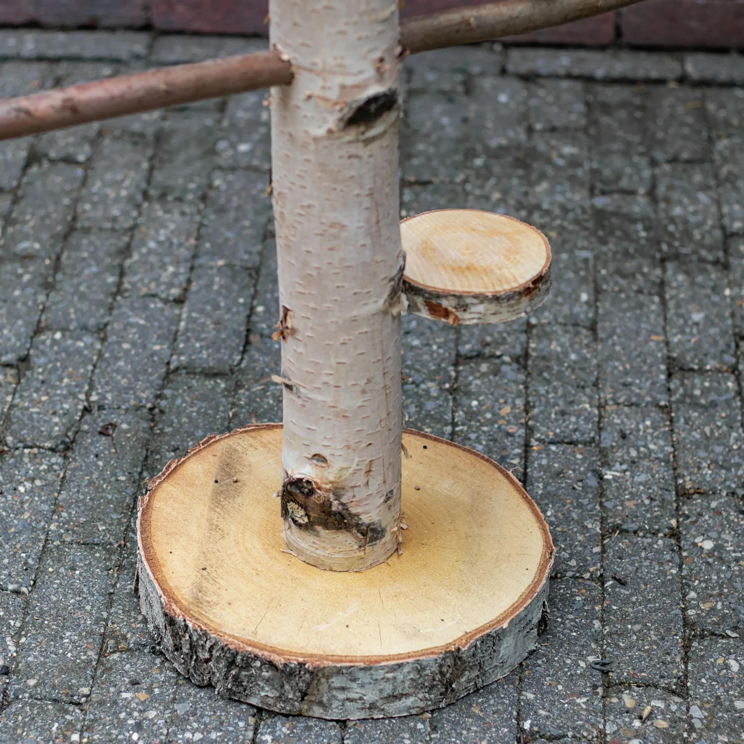 Vogelbaum Kiki aus einem Birkenstamm mit 3 runden Sitzen und 2 Sitzstangen und einer Futterplattform, Höhe 75 cm.