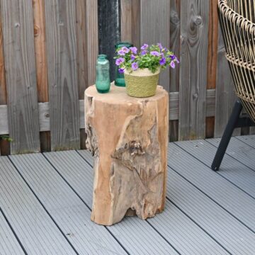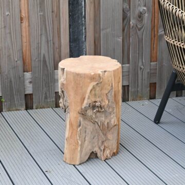 Mit ihrer warmen Holzfarbe und robusten Ausstrahlung eignet sich die Teak-Baumstammsäule hervorragend als Sockel für Pflanze, Skulptur oder Lampe – oder als eigenständiger Blickfang im Interieur. Die stabile Basis und die glatt verarbeitete Oberseite machen sie zugleich praktisch und dekorativ.