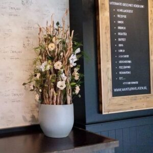 Sie können aber auch das Ast-Arrangement mit Blüten highlighten. Wir empfehlen Ihnen, dafür Kunstblumen zu verwenden. Hochwertige Seidenblumen von guter Qualität sind kaum von echten Blumen zu unterscheiden.